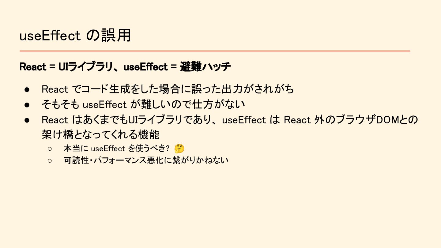 React でコード生成をした場合に誤った出力がされがち • そもそも useEffect が難しいので仕方がない • React はあくまでもUIライブラリであり、 useEffect は React 外のブラウザDOMとの 架け橋となってくれる機能 ◦ 本当に useEffect を使うべき? 🤔 ◦ 可読性・パフォーマンス悪化に繋がりかねない