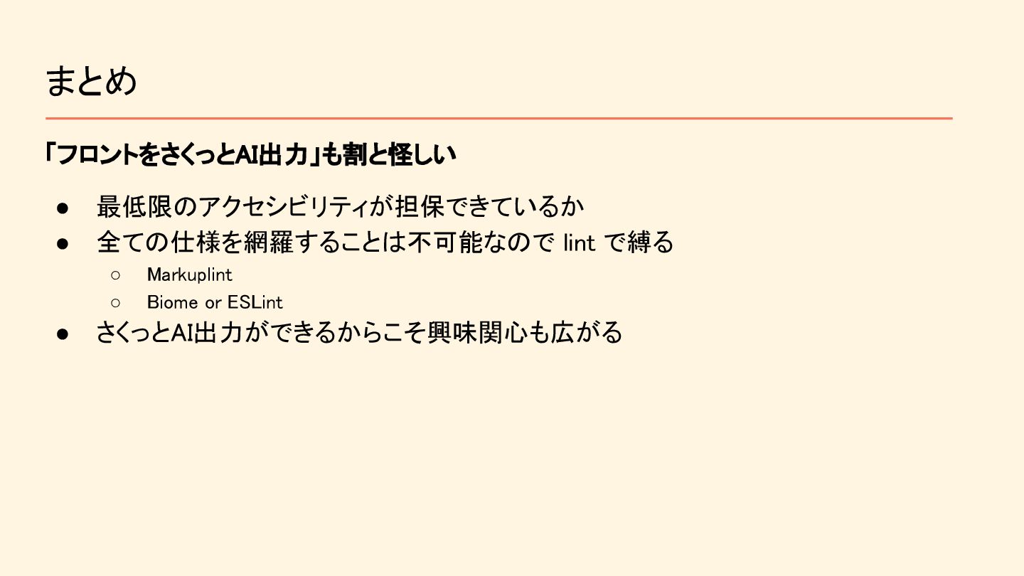 ◦ Biome or ESLint • さくっとAI出力ができるからこそ興味関心も広がる まとめ