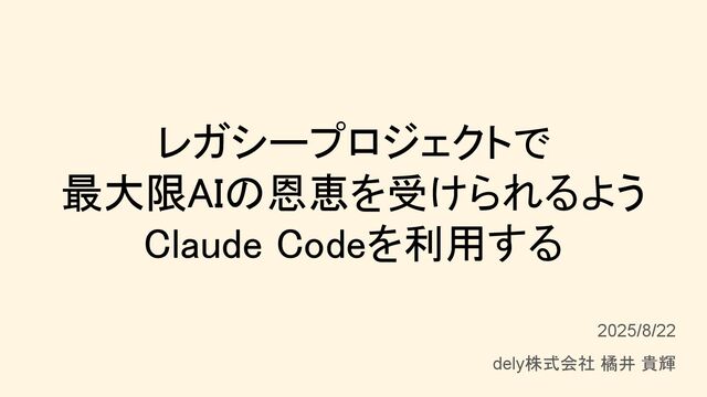 レガシープロジェクトで 最大限AIの恩恵を受けられるよう Claude Codeを利用する 2025/8/22 dely株式会社 橘井 貴輝