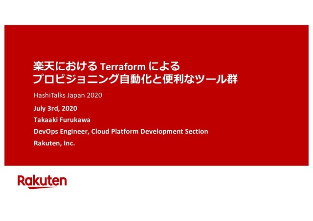 楽天における Terraform による プロビジョニング⾃動化と便利なツール群 July 3rd, 2020 Takaaki Furukawa DevOps