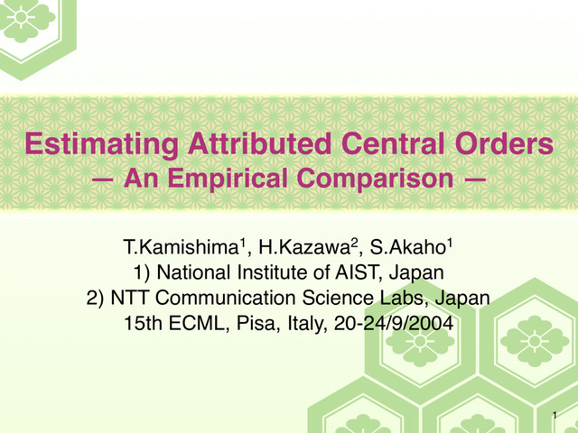 T. Kamishima, H. Kazawa, and S. Akaho “Estimating Attributed Central Orders — An Empirical Comparison” Proceedings of the 15th European Conference on Machine Learning (ECML), pp.563-565 (2004) [LNAI 3201]