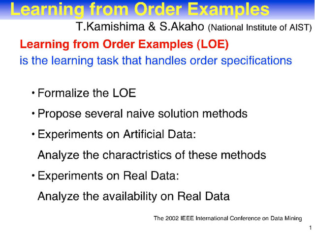 T. Kamishima and S. Akaho “Learning from Order Examples” Proceedings of the 2nd IEEE International Conference on Data Mining (ICDM), pp.645-648 (2002)