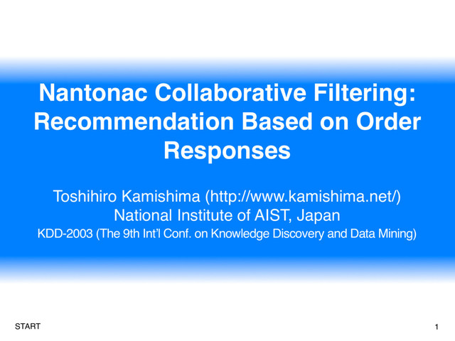 T. Kamishima “Nantonac Collaborative Filtering: Recommendation Based on Order Responses” Proceedings of the 9th International Conference on Knowledge Discovery and Data Mining (KDD), pp.583-588 (2003)