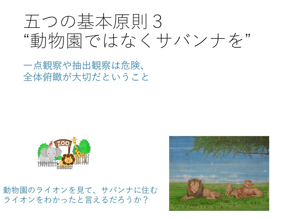 五つの基本原則3 “動物園ではなくサバンナを” 一点観察や抽出観察は危険、 全体俯瞰が大切だということ 動物園のライオンを見て、サバンナに住む ライオンをわかったと言えるだろうか?
