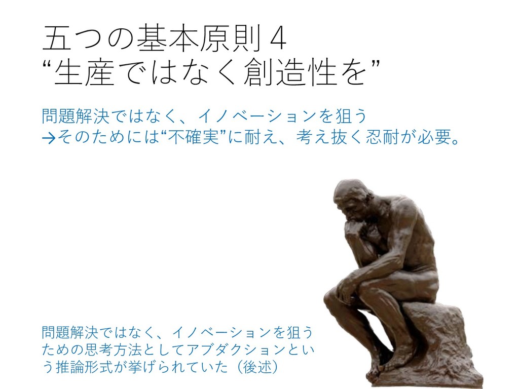 五つの基本原則4 “生産ではなく創造性を” 問題解決ではなく、イノベーションを狙う →そのためには“不確実”に耐え、考え抜く忍耐が必要。 問題解決ではなく、イノベーションを狙う ための思考方法としてアブダクションとい う推論形式が挙げられていた(後述)