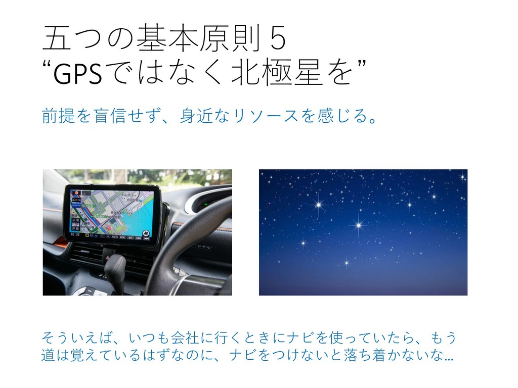 五つの基本原則5 “GPSではなく北極星を” 前提を盲信せず、身近なリソースを感じる。 そういえば、いつも会社に行くときにナビを使っていたら、もう 道は覚えているはずなのに、ナビをつけないと落ち着かないな…