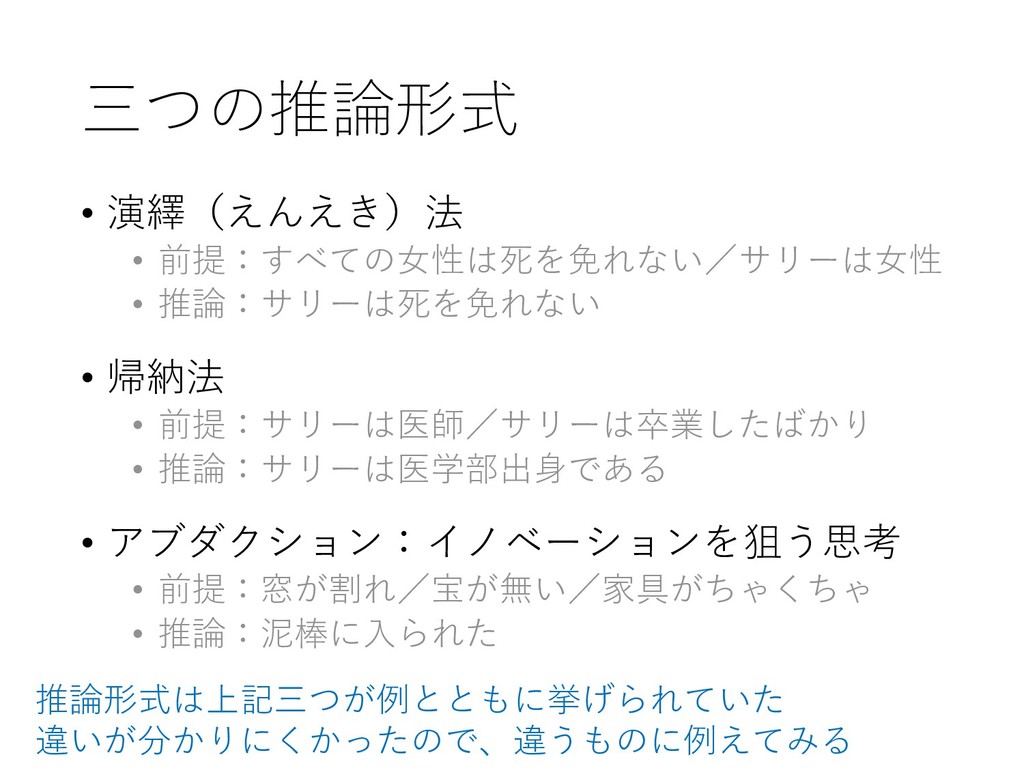 前提:サリーは医師/サリーは卒業したばかり • 推論:サリーは医学部出身である • アブダクション:イノベーションを狙う思考 • 前提:窓が割れ/宝が無い/家具がちゃくちゃ • 推論:泥棒に入られた 推論形式は上記三つが例とともに挙げられていた 違いが分かりにくかったので、違うものに例えてみる