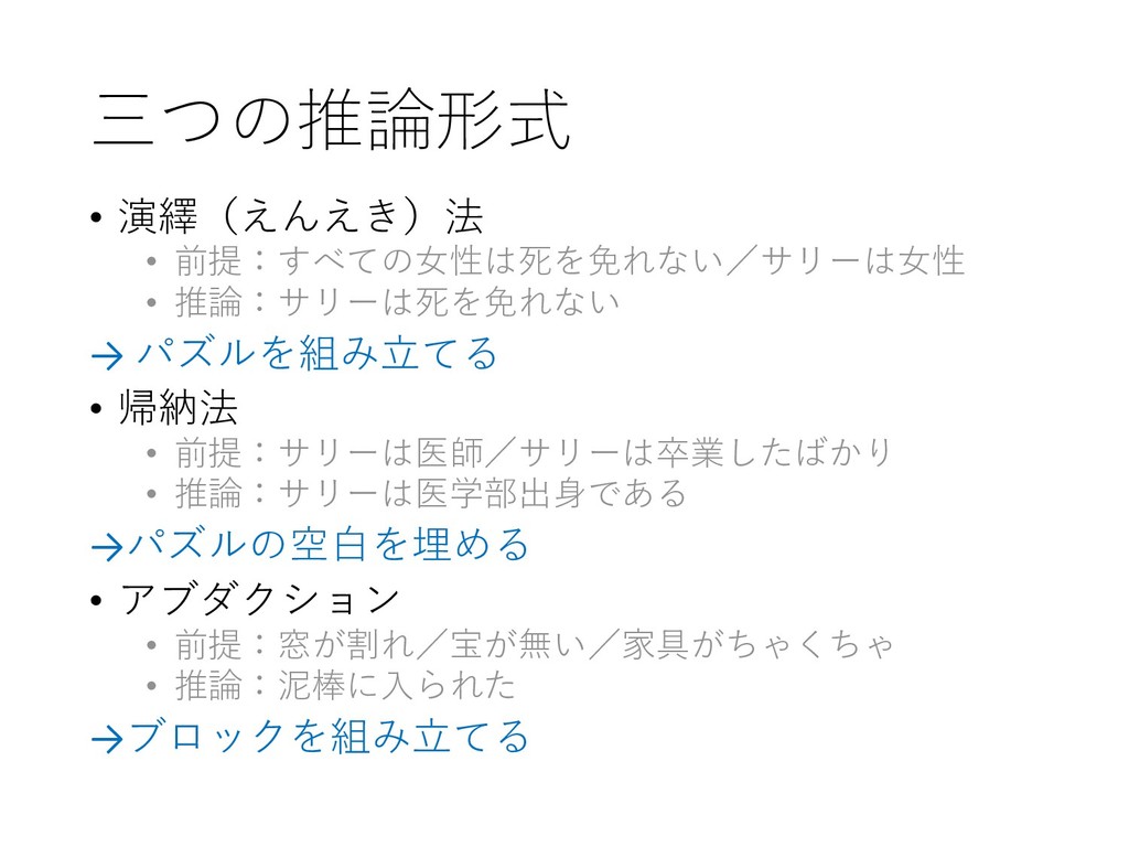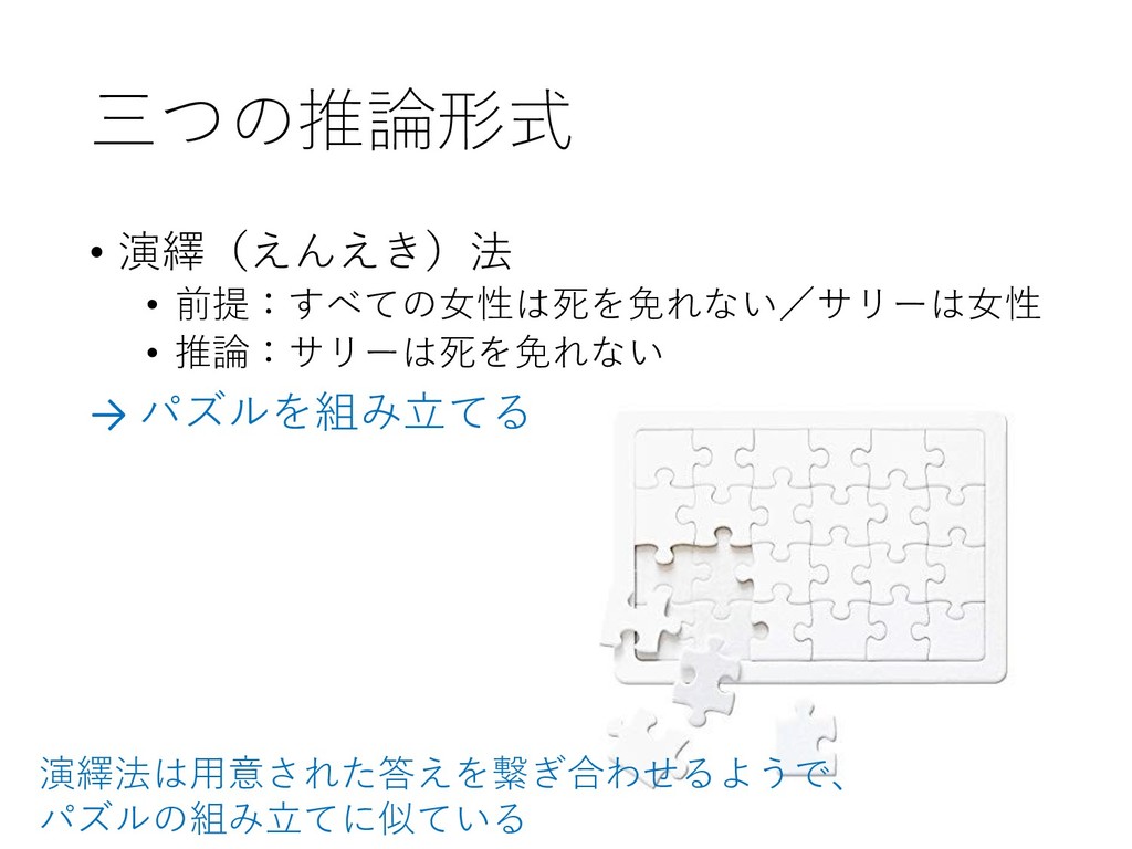 三つの推論形式 • 演繹(えんえき)法 • 前提:すべての女性は死を免れない/サリーは女性 • 推論:サリーは死を免れない → パズルを組み立てる 演繹法は用意された答えを繋ぎ合わせるようで、