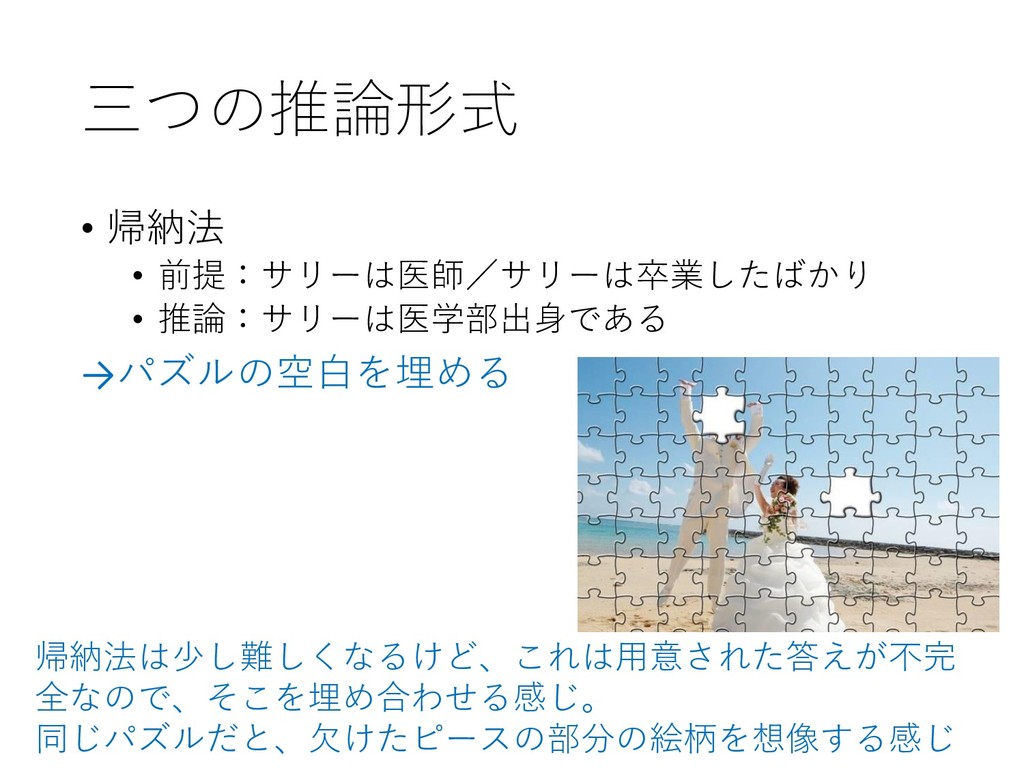 三つの推論形式 • 帰納法 • 前提:サリーは医師/サリーは卒業したばかり • 推論:サリーは医学部出身である →パズルの空白を埋める 帰納法は少し難しくなるけど、これは用意された答えが不完 全なので、そこを埋め合わせる感じ。