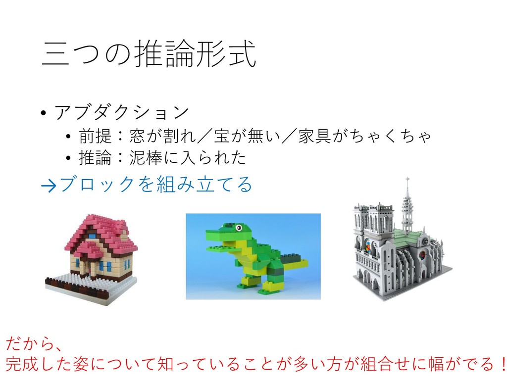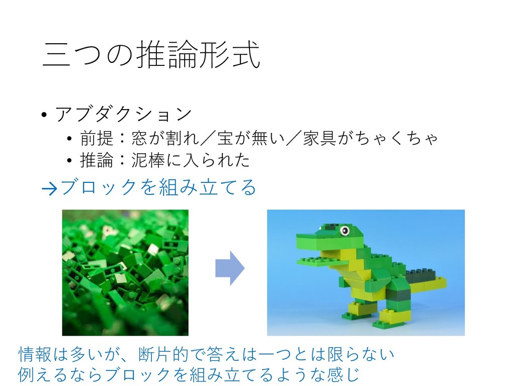三つの推論形式 • アブダクション • 前提:窓が割れ/宝が無い/家具がちゃくちゃ • 推論:泥棒に入られた →ブロックを組み立てる 情報は多いが、断片的で答えは一つとは限らない 例えるならブロックを組み立てるような感じ