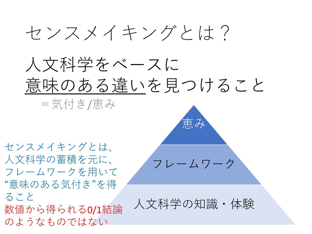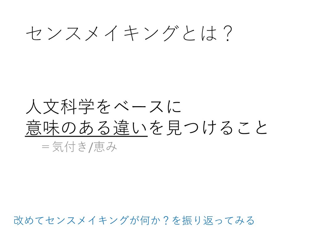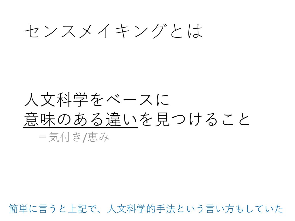 センスメイキングとは 人文科学をベースに 意味のある違いを見つけること =気付き/恵み 簡単に言うと上記で、人文科学的手法という言い方もしていた