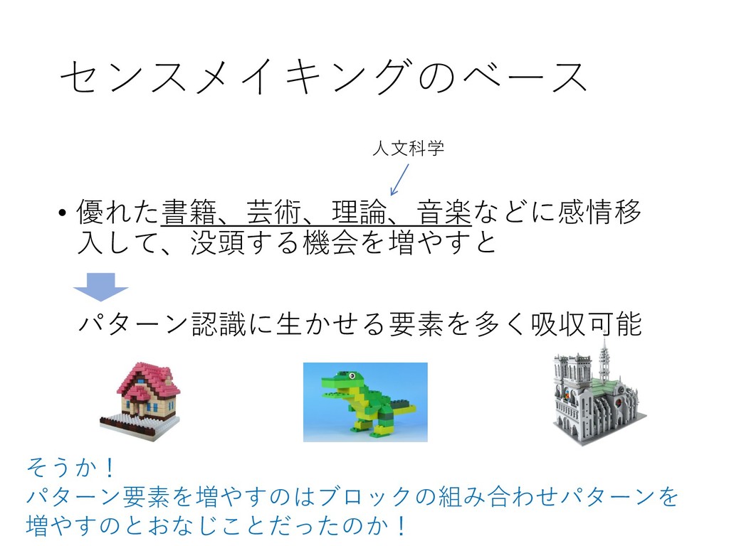 センスメイキングのベース • 優れた書籍、芸術、理論、音楽などに感情移 入して、没頭する機会を増やすと パターン認識に生かせる要素を多く吸収可能 そうか! パターン要素を増やすのはブロックの組み合わせパターンを 増やすのとおなじことだったのか! 人文科学