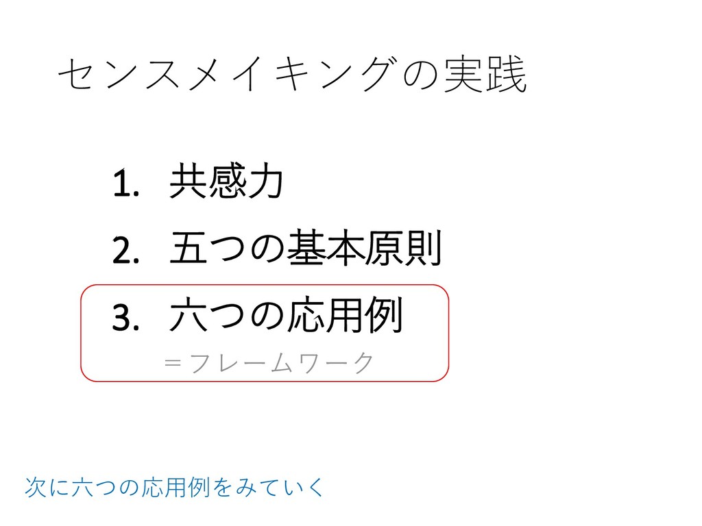 センスメイキングの実践 1. 共感力 2. 五つの基本原則 3. 六つの応用例 =フレームワーク 次に六つの応用例をみていく
