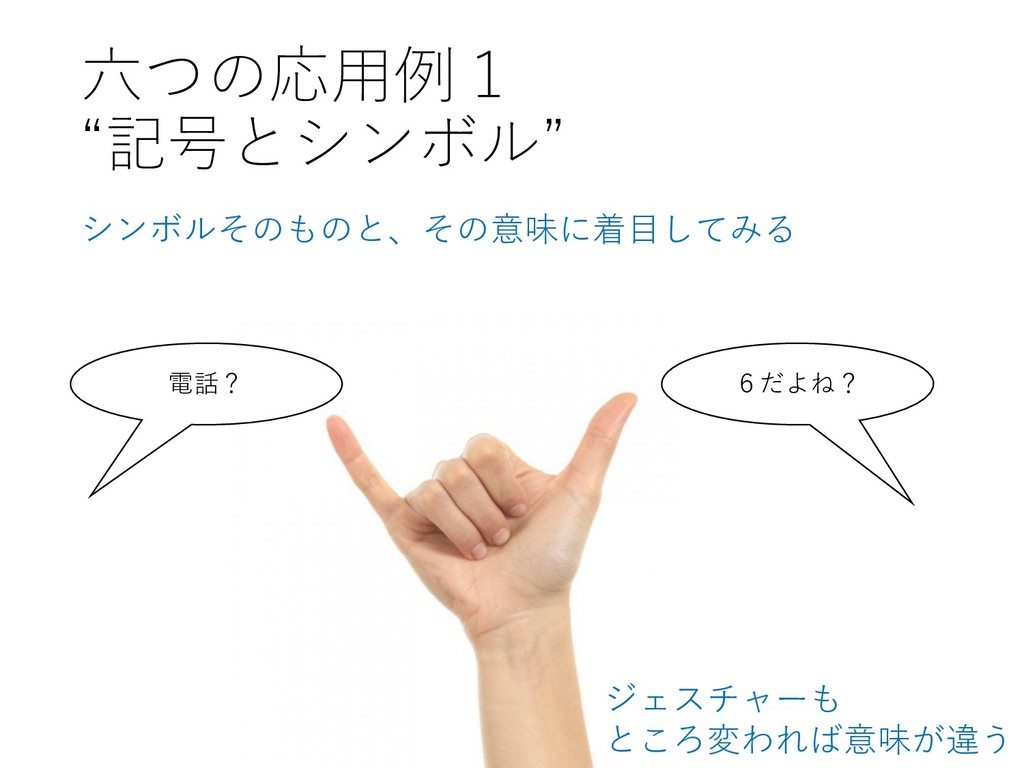 六つの応用例1 “記号とシンボル” シンボルそのものと、その意味に着目してみる 電話? 6だよね? ジェスチャーも ところ変われば意味が違う