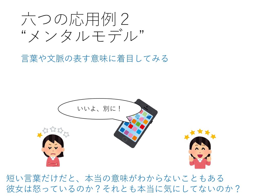 六つの応用例2 “メンタルモデル” 言葉や文脈の表す意味に着目してみる いいよ、別に! 短い言葉だけだと、本当の意味がわからないこともある 彼女は怒っているのか?それとも本当に気にしてないのか?
