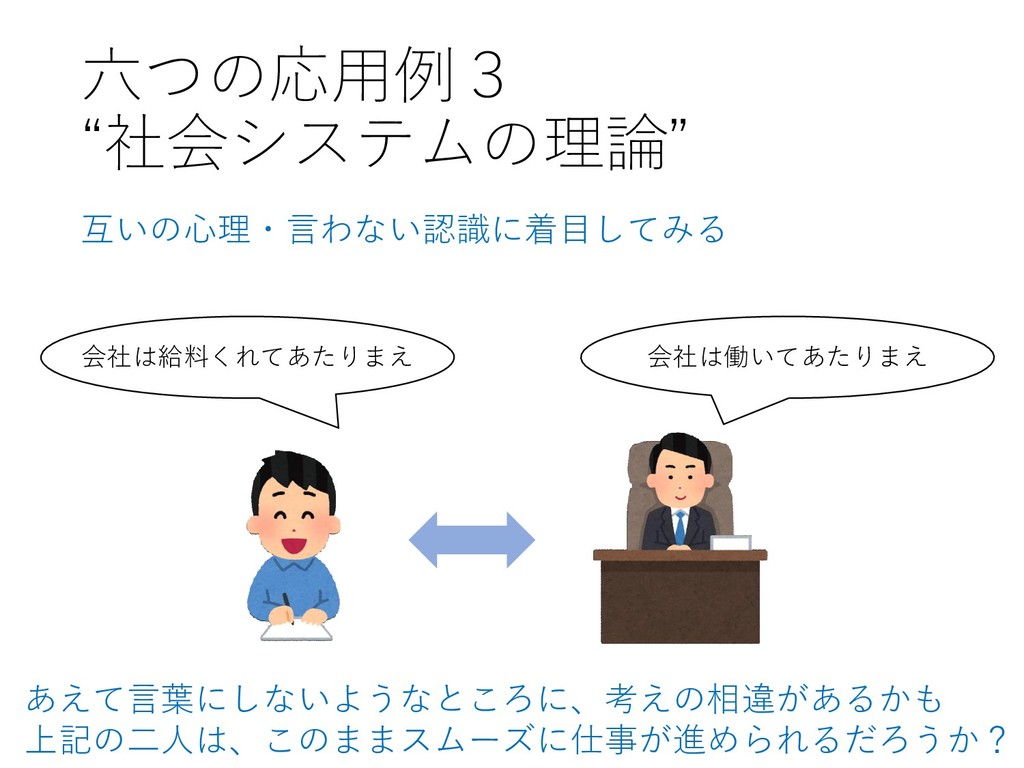 六つの応用例3 “社会システムの理論” 互いの心理・言わない認識に着目してみる 会社は給料くれてあたりまえ 会社は働いてあたりまえ あえて言葉にしないようなところに、考えの相違があるかも 上記の二人は、このままスムーズに仕事が進められるだろうか?