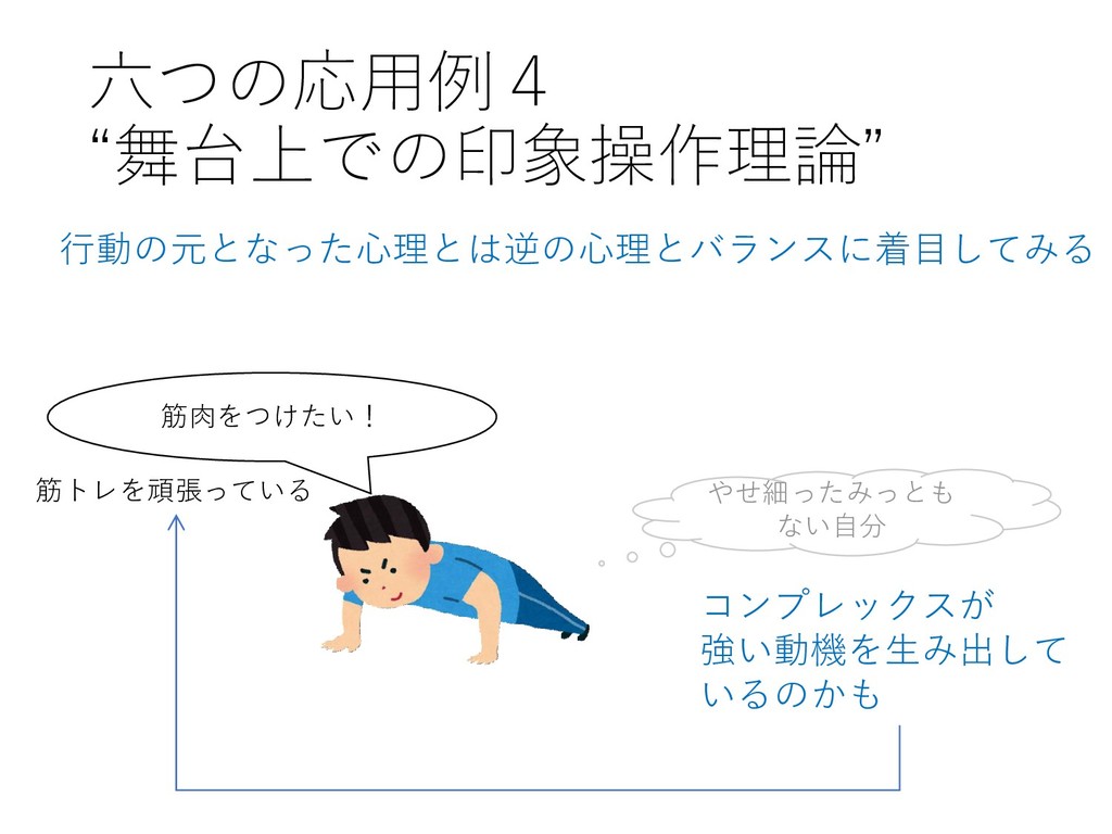 六つの応用例4 “舞台上での印象操作理論” 行動の元となった心理とは逆の心理とバランスに着目してみる 筋肉をつけたい! 筋トレを頑張っている コンプレックスが 強い動機を生み出して いるのかも やせ細ったみっとも ない自分