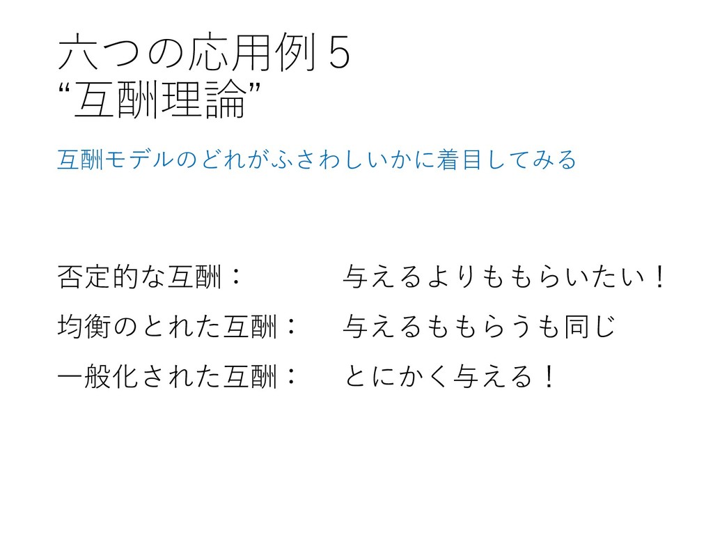 六つの応用例5 “互酬理論” 互酬モデルのどれがふさわしいかに着目してみる 否定的な互酬: 与えるよりももらいたい! 均衡のとれた互酬: 与えるももらうも同じ 一般化された互酬: とにかく与える!