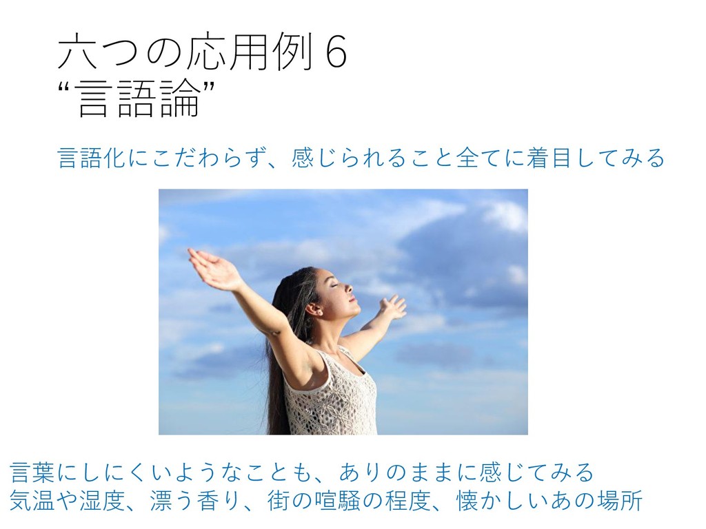 六つの応用例6 “言語論” 言語化にこだわらず、感じられること全てに着目してみる 言葉にしにくいようなことも、ありのままに感じてみる 気温や湿度、漂う香り、街の喧騒の程度、懐かしいあの場所