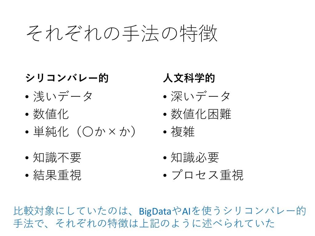 • 結果重視 人文科学的 • 深いデータ • 数値化困難 • 複雑 • 知識必要 • プロセス重視 比較対象にしていたのは、BigDataやAIを使うシリコンバレー的 手法で、それぞれの特徴は上記のように述べられていた