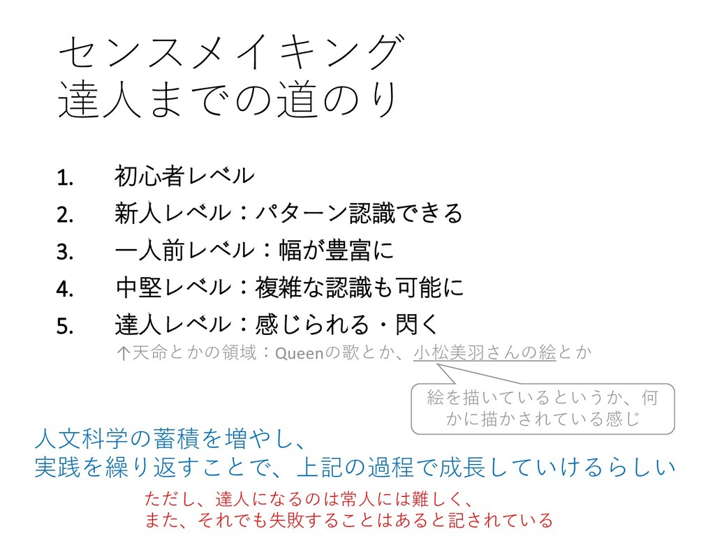 5. 達人レベル:感じられる・閃く ただし、達人になるのは常人には難しく、 また、それでも失敗することはあると記されている ↑天命とかの領域:Queenの歌とか、小松美羽さんの絵とか 絵を描いているというか、何 かに描かされている感じ 人文科学の蓄積を増やし、 実践を繰り返すことで、上記の過程で成長していけるらしい