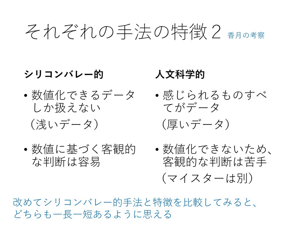 それぞれの手法の特徴2 シリコンバレー的 • 数値化できるデータ しか扱えない (浅いデータ) • 数値に基づく客観的 な判断は容易 人文科学的