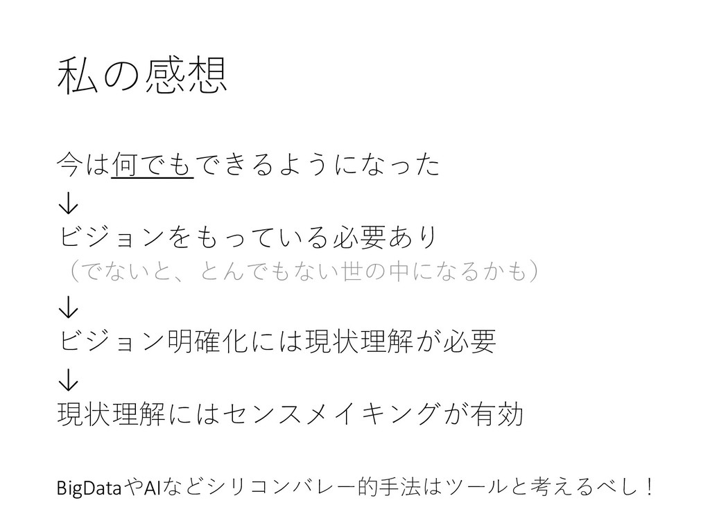 私の感想 今は何でもできるようになった ↓ ビジョンをもっている必要あり (でないと、とんでもない世の中になるかも) ↓ ビジョン明確化には現状理解が必要 ↓ 現状理解にはセンスメイキングが有効 BigDataやAIなどシリコンバレー的手法はツールと考えるべし!