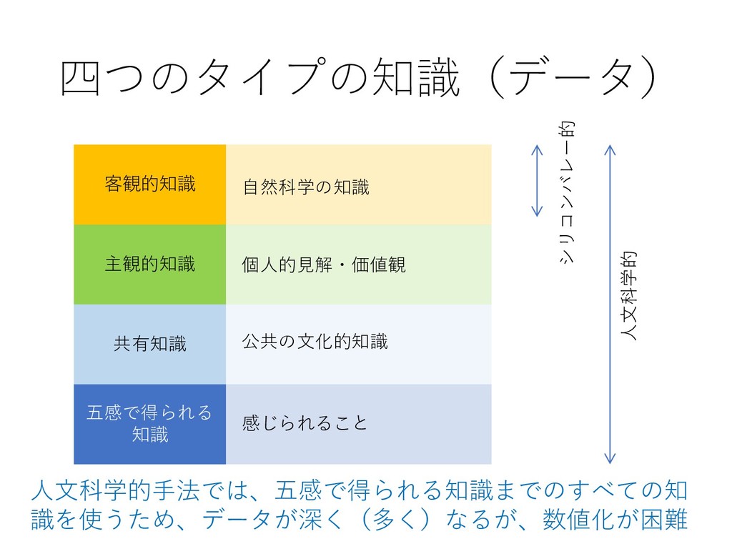 シリコンバレー的 人文科学的 人文科学的手法では、五感で得られる知識までのすべての知 識を使うため、データが深く(多く)なるが、数値化が困難