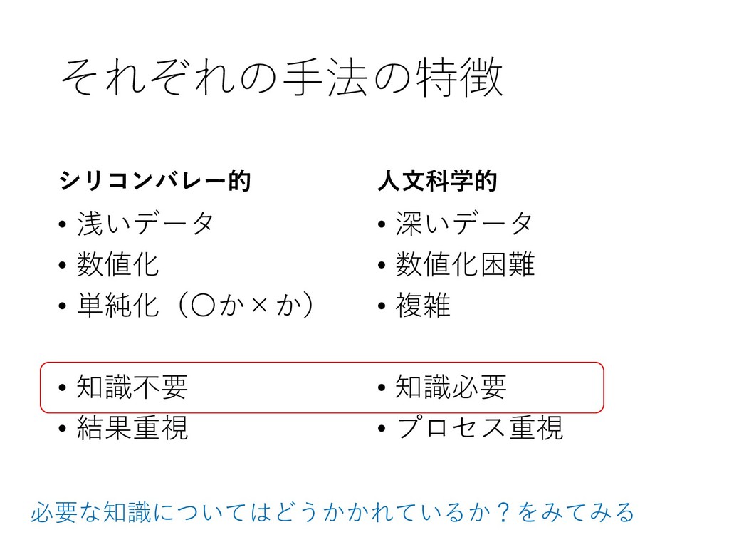 それぞれの手法の特徴 シリコンバレー的 • 浅いデータ • 数値化 • 単純化(〇か×か) • 知識不要