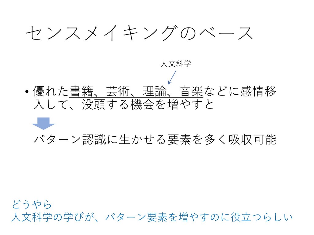 センスメイキングのベース • 優れた書籍、芸術、理論、音楽などに感情移 入して、没頭する機会を増やすと パターン認識に生かせる要素を多く吸収可能 どうやら 人文科学の学びが、パターン要素を増やすのに役立つらしい 人文科学