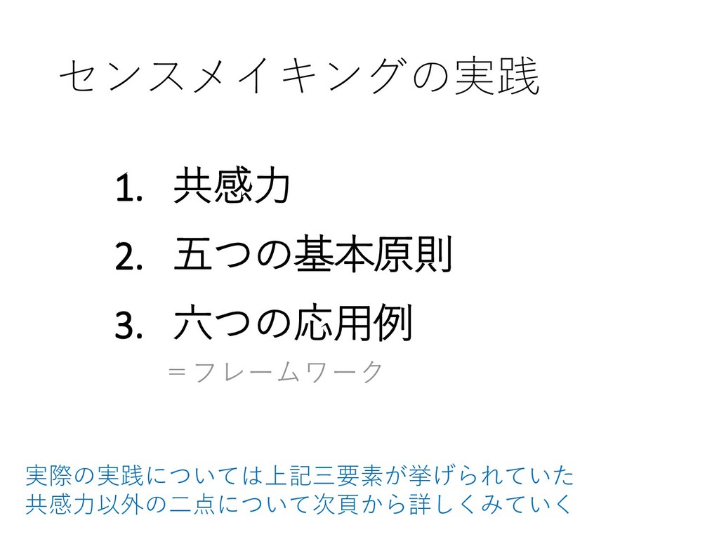 センスメイキングの実践 1. 共感力 2. 五つの基本原則 3. 六つの応用例 =フレームワーク 実際の実践については上記三要素が挙げられていた 共感力以外の二点について次頁から詳しくみていく