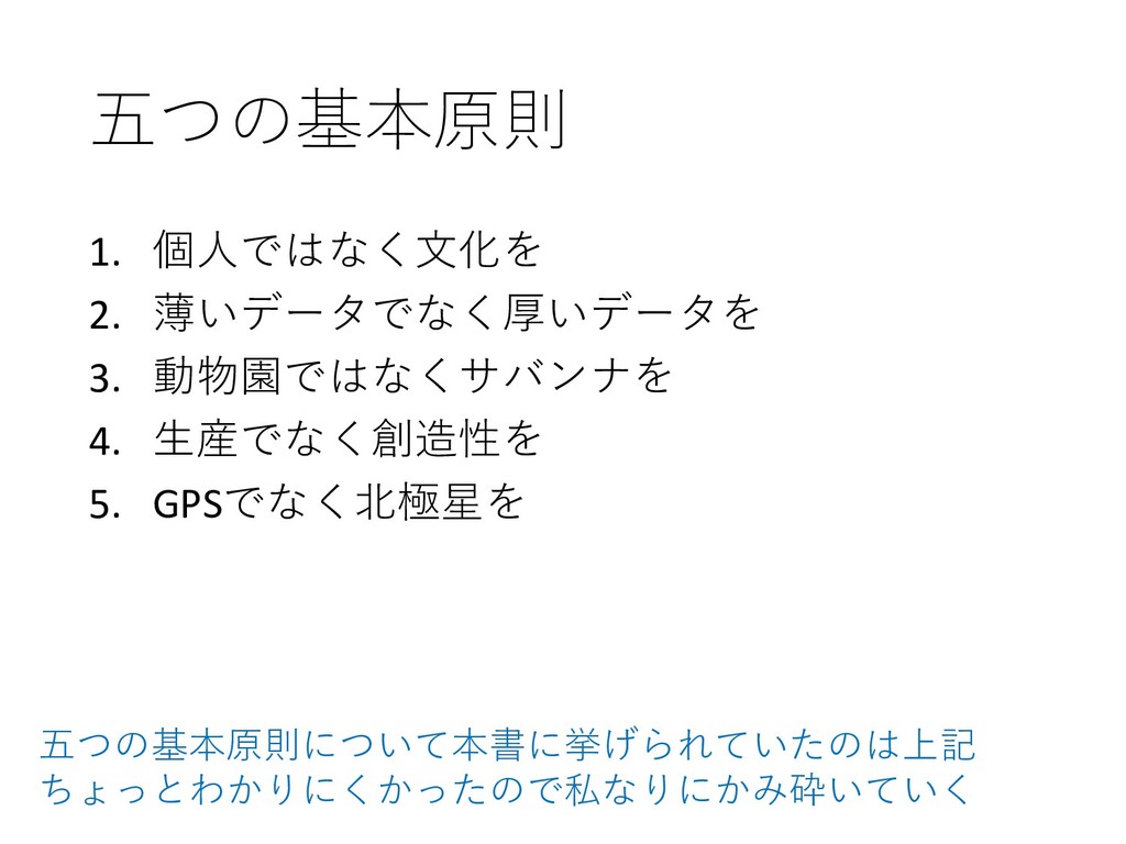 五つの基本原則 1. 個人ではなく文化を 2. 薄いデータでなく厚いデータを 3. 動物園ではなくサバンナを 4. 生産でなく創造性を 5.