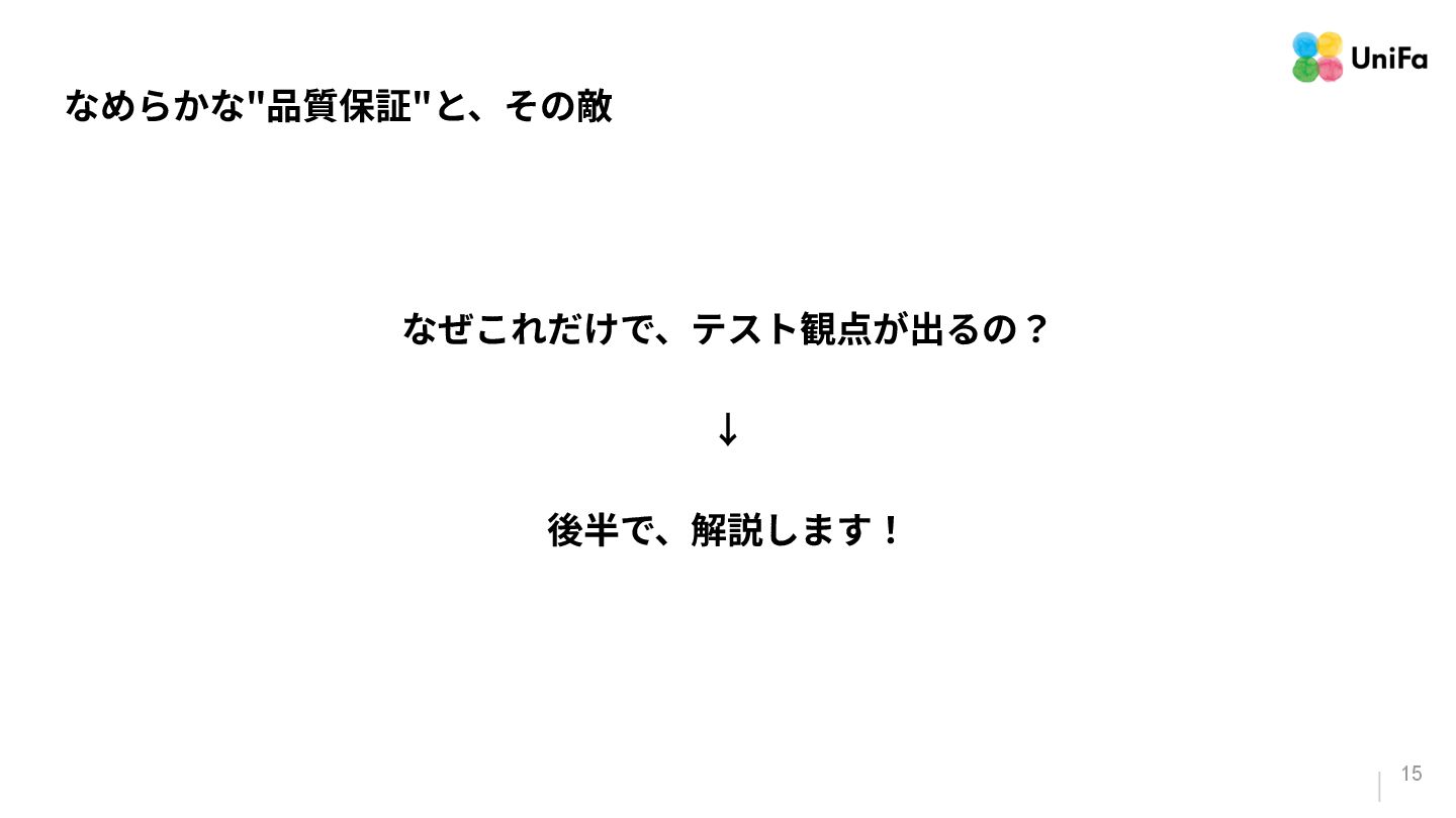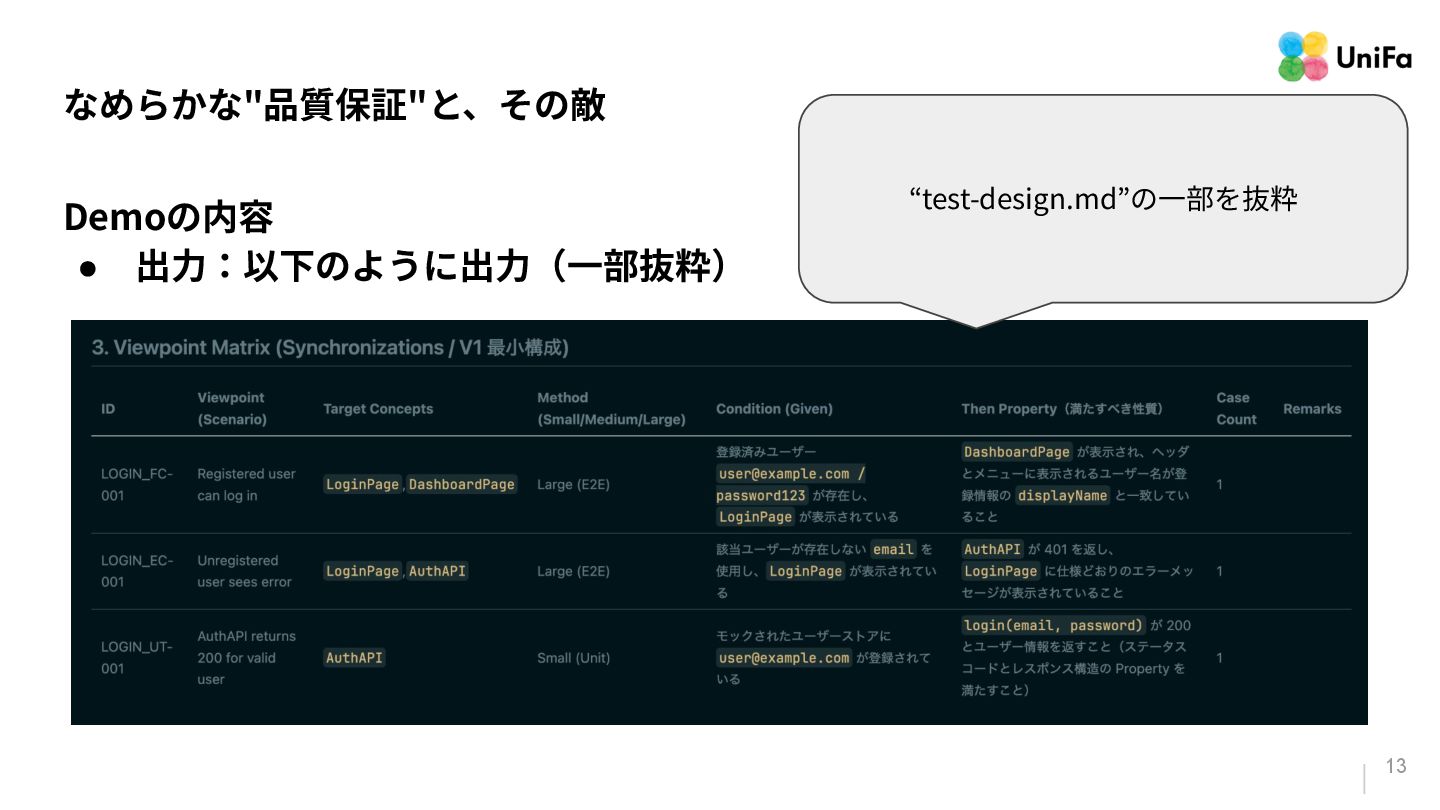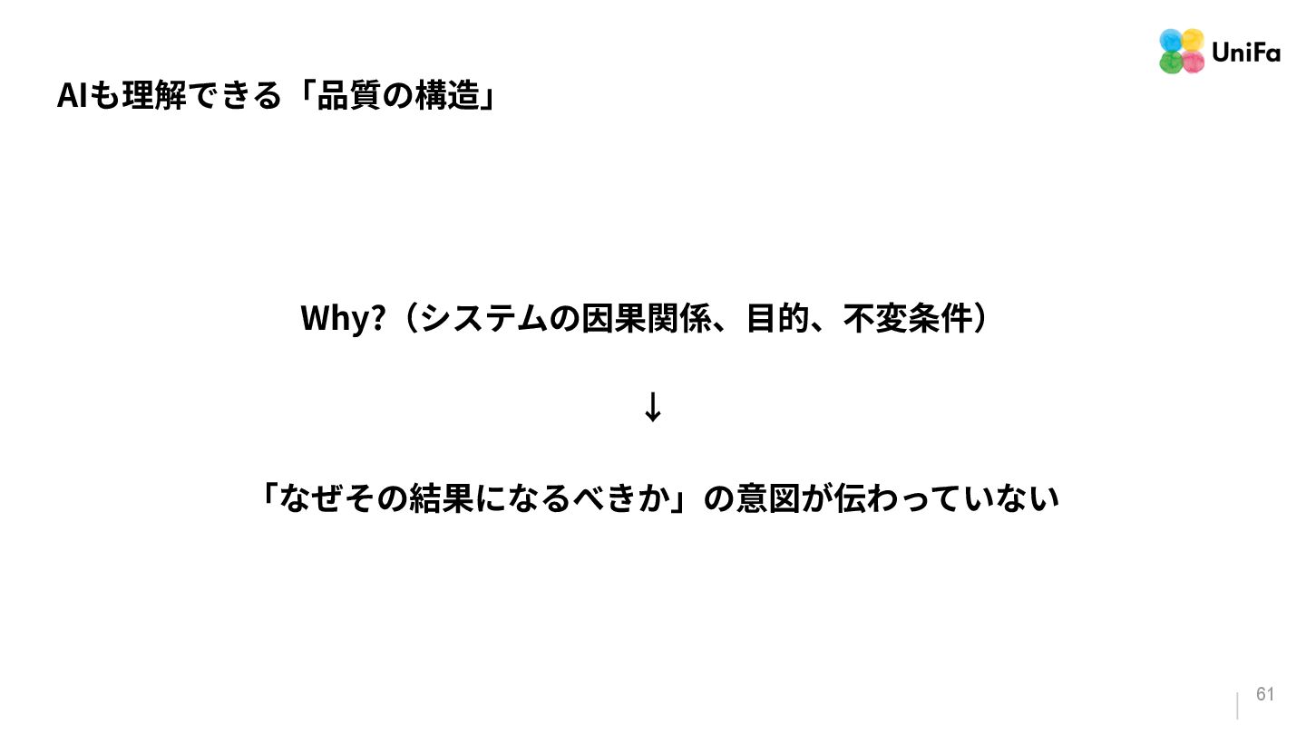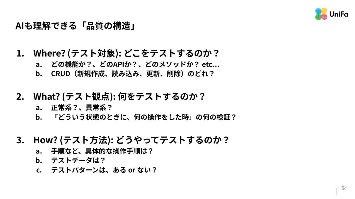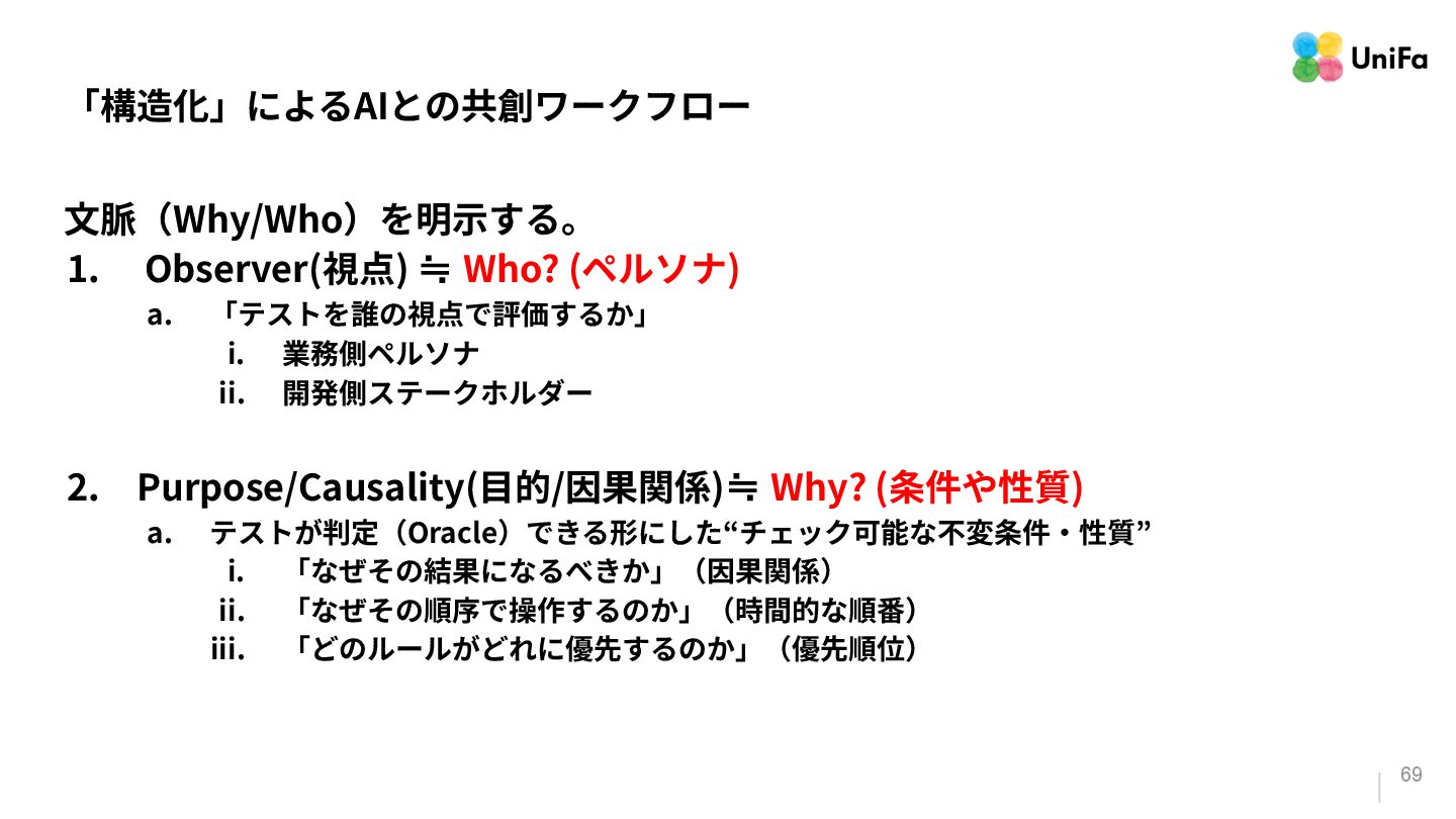 i. 業務側ペルソナ ii. 開発側ステークホルダー 2. Purpose/Causality(⽬的/因果関係)≒ Why? (条件や性質) a. テストが判定(Oracle)できる形にした“チェック可能な不変条件‧性質” i. 「なぜその結果になるべきか」(因果関係) ii. 「なぜその順序で操作するのか」(時間的な順番) iii. 「どのルールがどれに優先するのか」(優先順位)