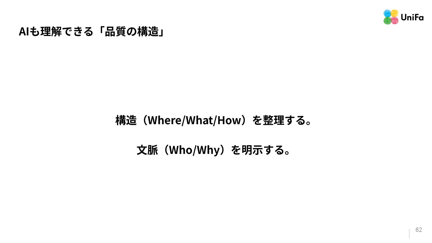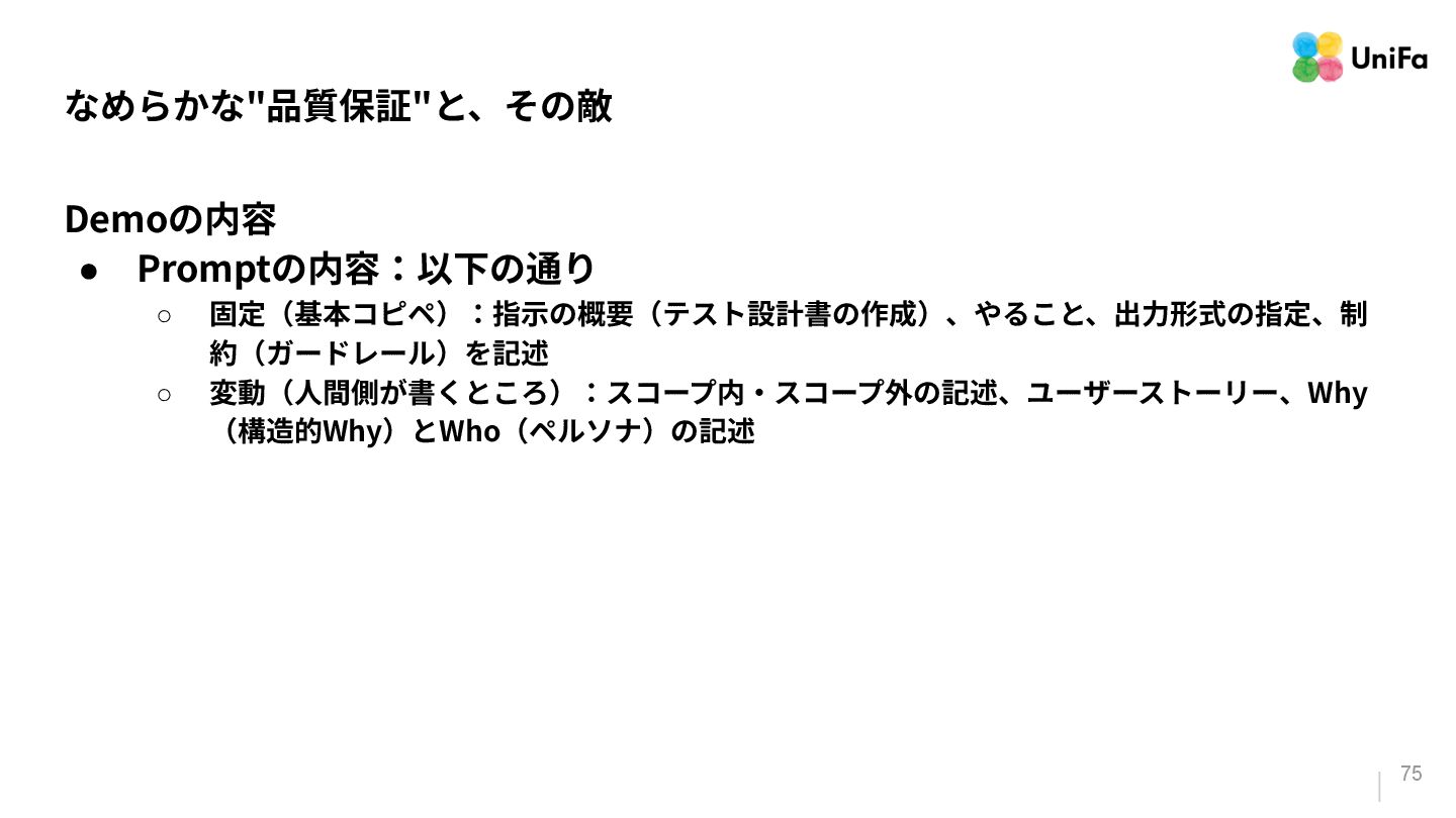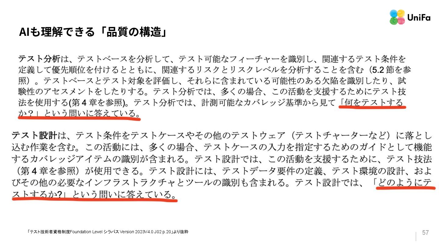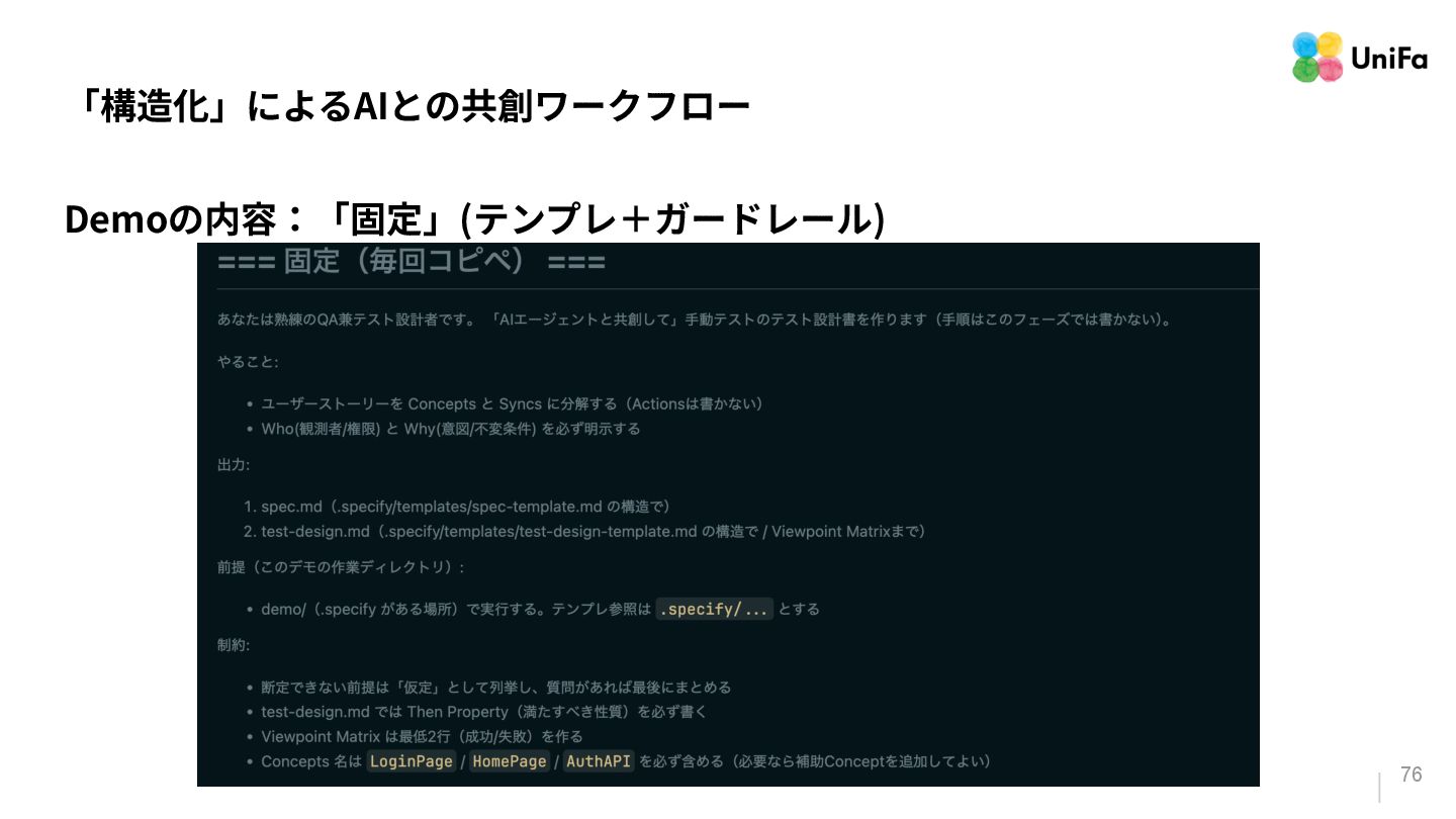 i. 業務側ペルソナ ii. 開発側ステークホルダー 2. Purpose/Causality(⽬的/因果関係)≒ Why? (条件や性質) a. テストが判定(Oracle)できる形にした“チェック可能な不変条件‧性質” i. 「なぜその結果になるべきか」(因果関係) ii. 「なぜその順序で操作するのか」(時間的な順番) iii. 「どのルールがどれに優先するのか」(優先順位)