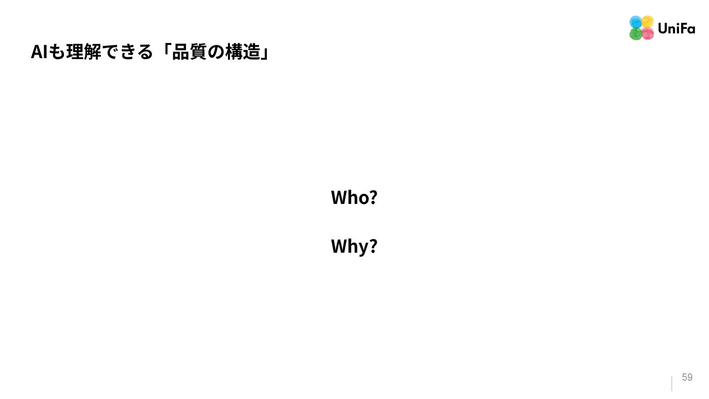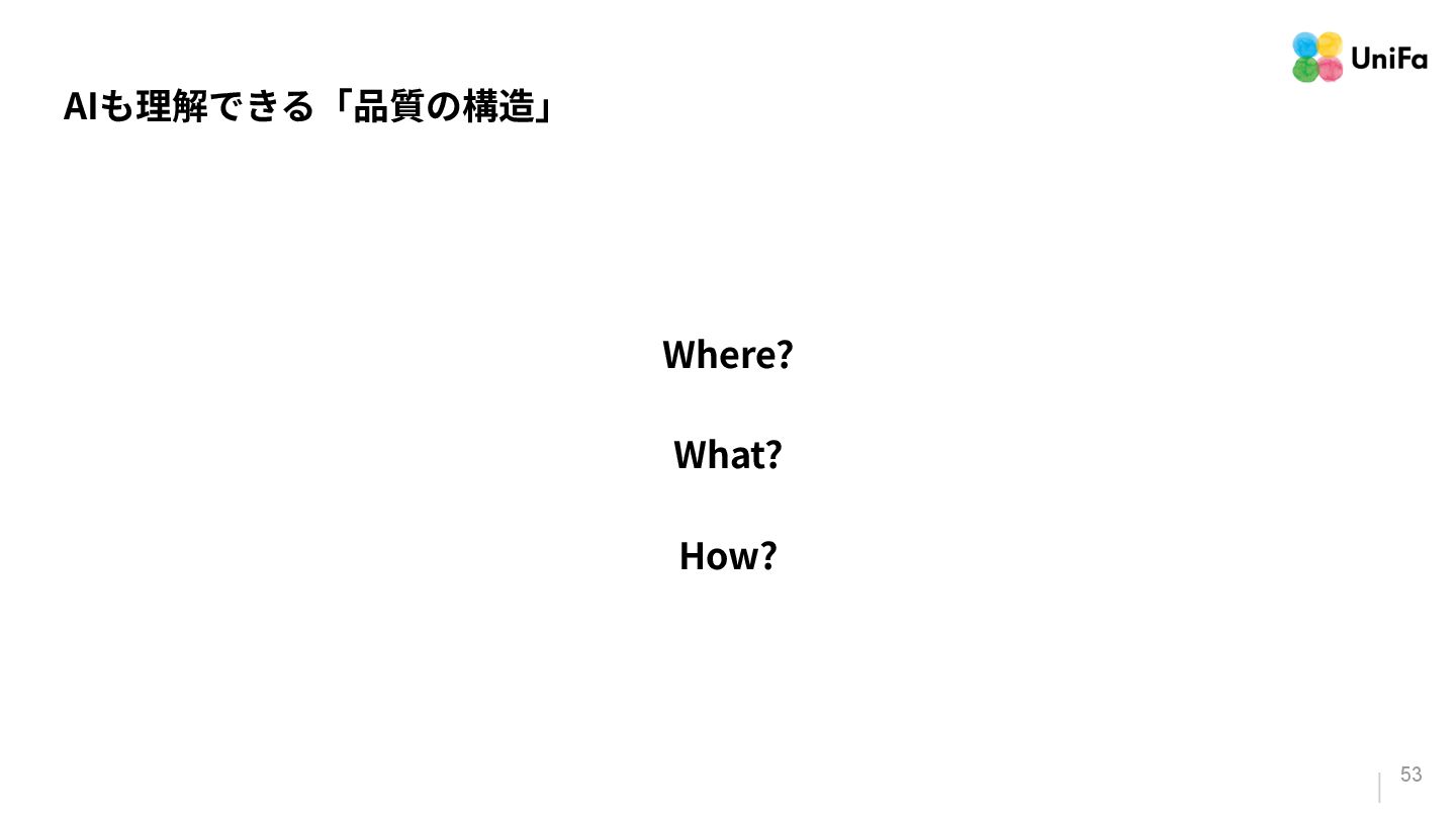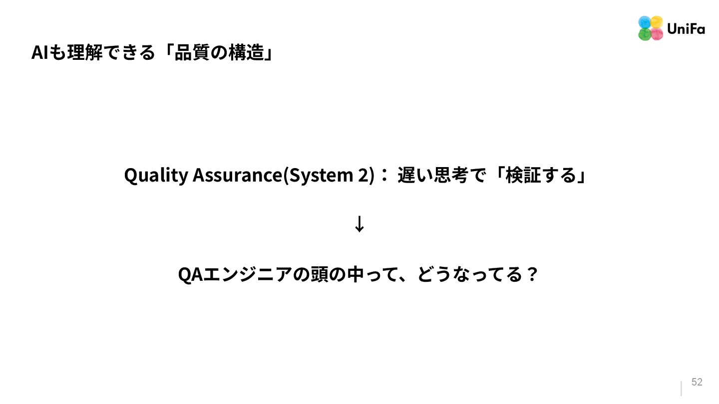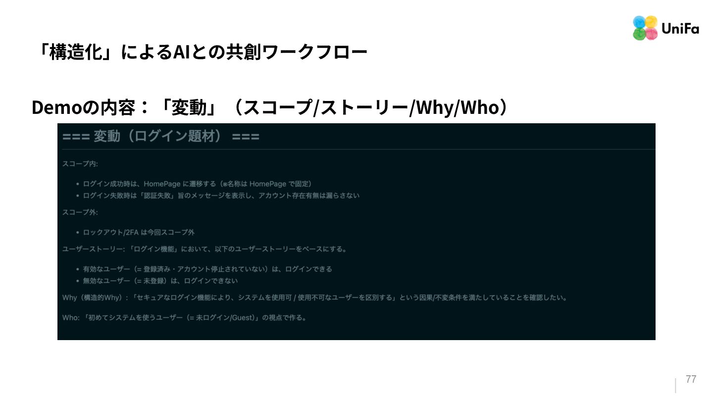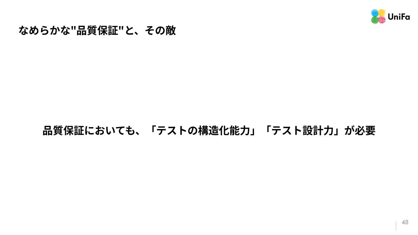 i. 業務側ペルソナ ii. 開発側ステークホルダー 2. Purpose/Causality(⽬的/因果関係)≒ Why? (条件や性質) a. テストが判定(Oracle)できる形にした“チェック可能な不変条件‧性質” i. 「なぜその結果になるべきか」(因果関係) ii. 「なぜその順序で操作するのか」(時間的な順番) iii. 「どのルールがどれに優先するのか」(優先順位)