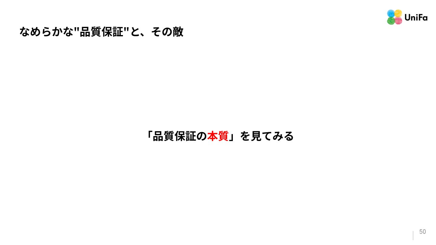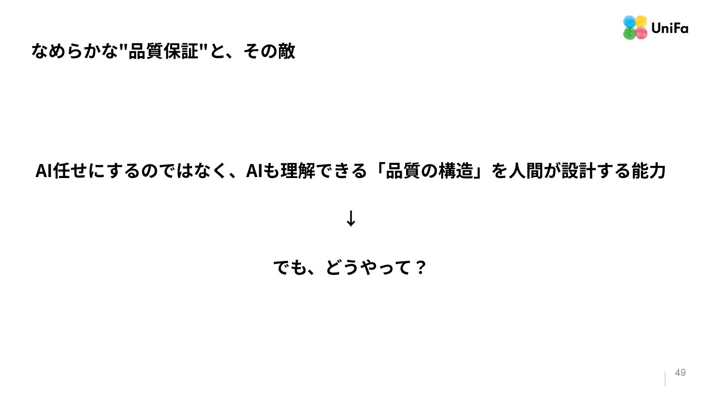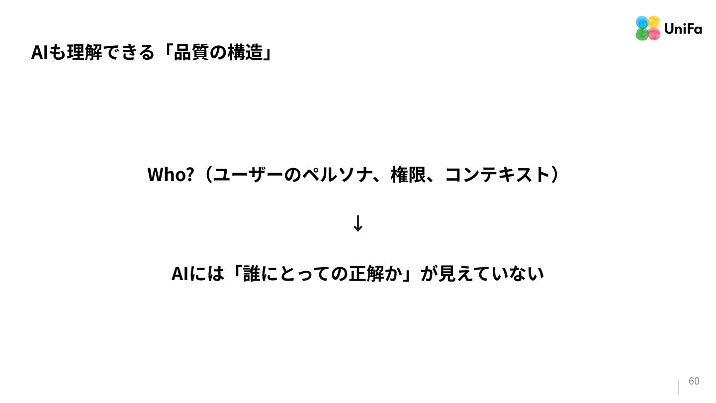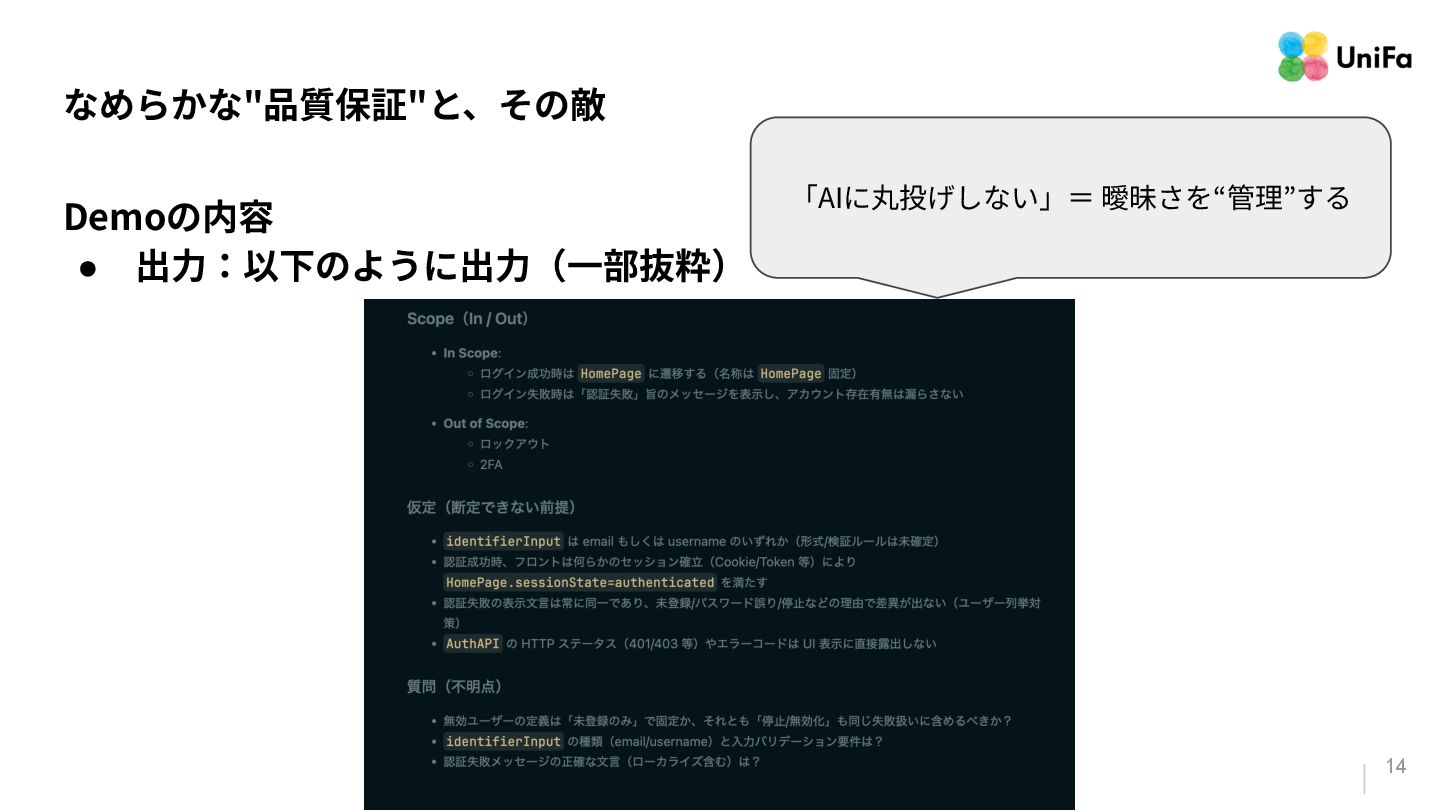 i. 業務側ペルソナ ii. 開発側ステークホルダー 2. Purpose/Causality(⽬的/因果関係)≒ Why? (条件や性質) a. テストが判定(Oracle)できる形にした“チェック可能な不変条件‧性質” i. 「なぜその結果になるべきか」(因果関係) ii. 「なぜその順序で操作するのか」(時間的な順番) iii. 「どのルールがどれに優先するのか」(優先順位)