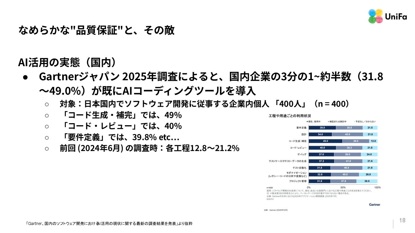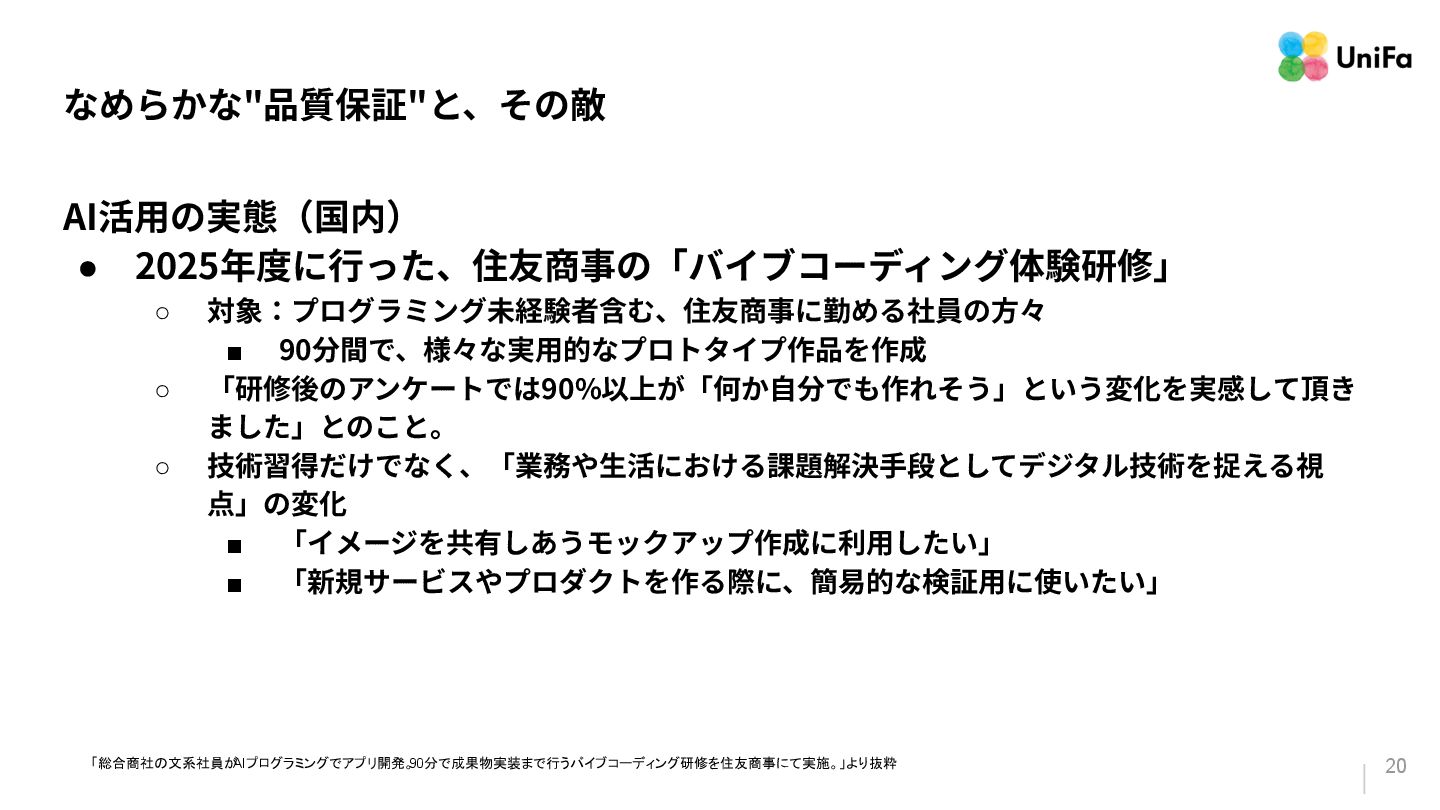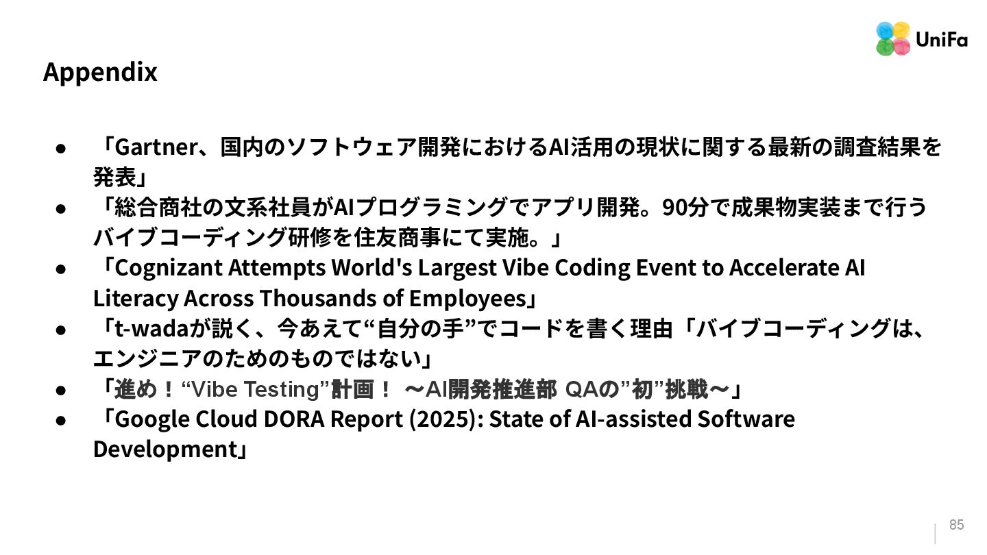 Attempts World's Largest Vibe Coding Event to Accelerate AI Literacy Across Thousands of Employees」 • 「t-wadaが説く、今あえて“⾃分の⼿”でコードを書く理由「バイブコーディングは、 エンジニアのためのものではない」 • 「進め!“Vibe Testing”計画! 〜AI開発推進部 QAの”初”挑戦〜」 • 「Google Cloud DORA Report (2025): State of AI-assisted Software Development」