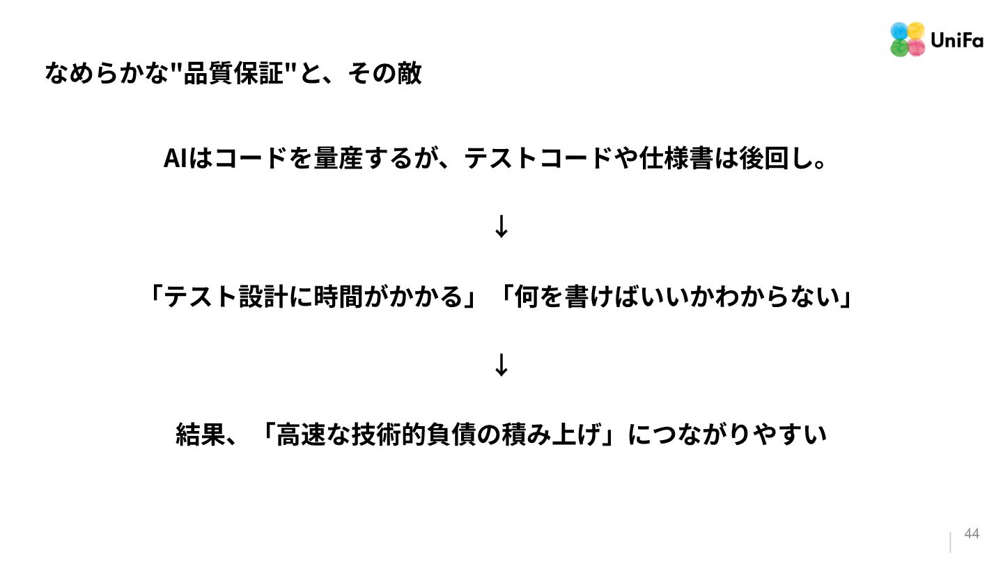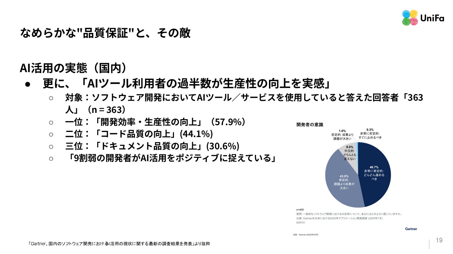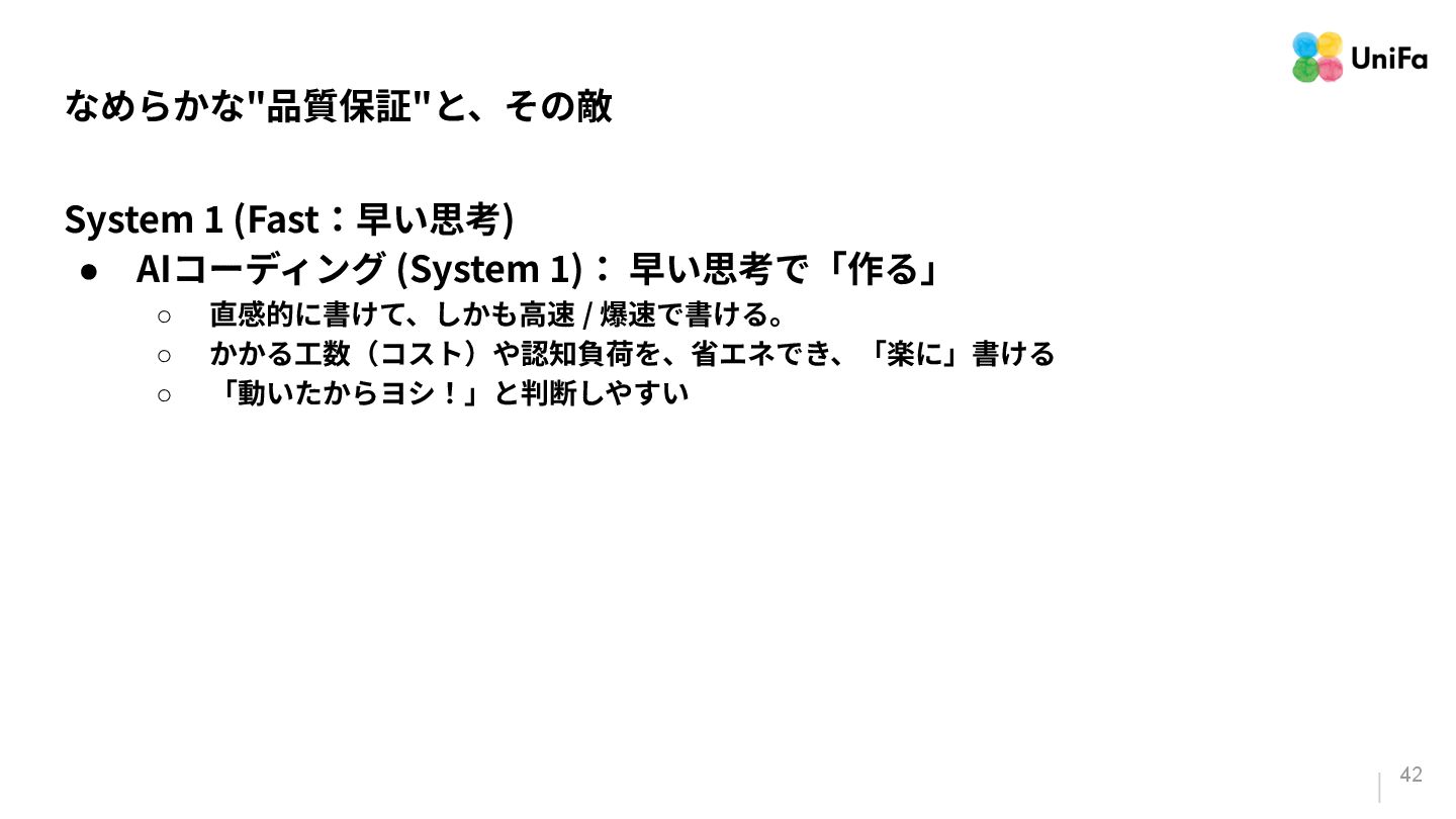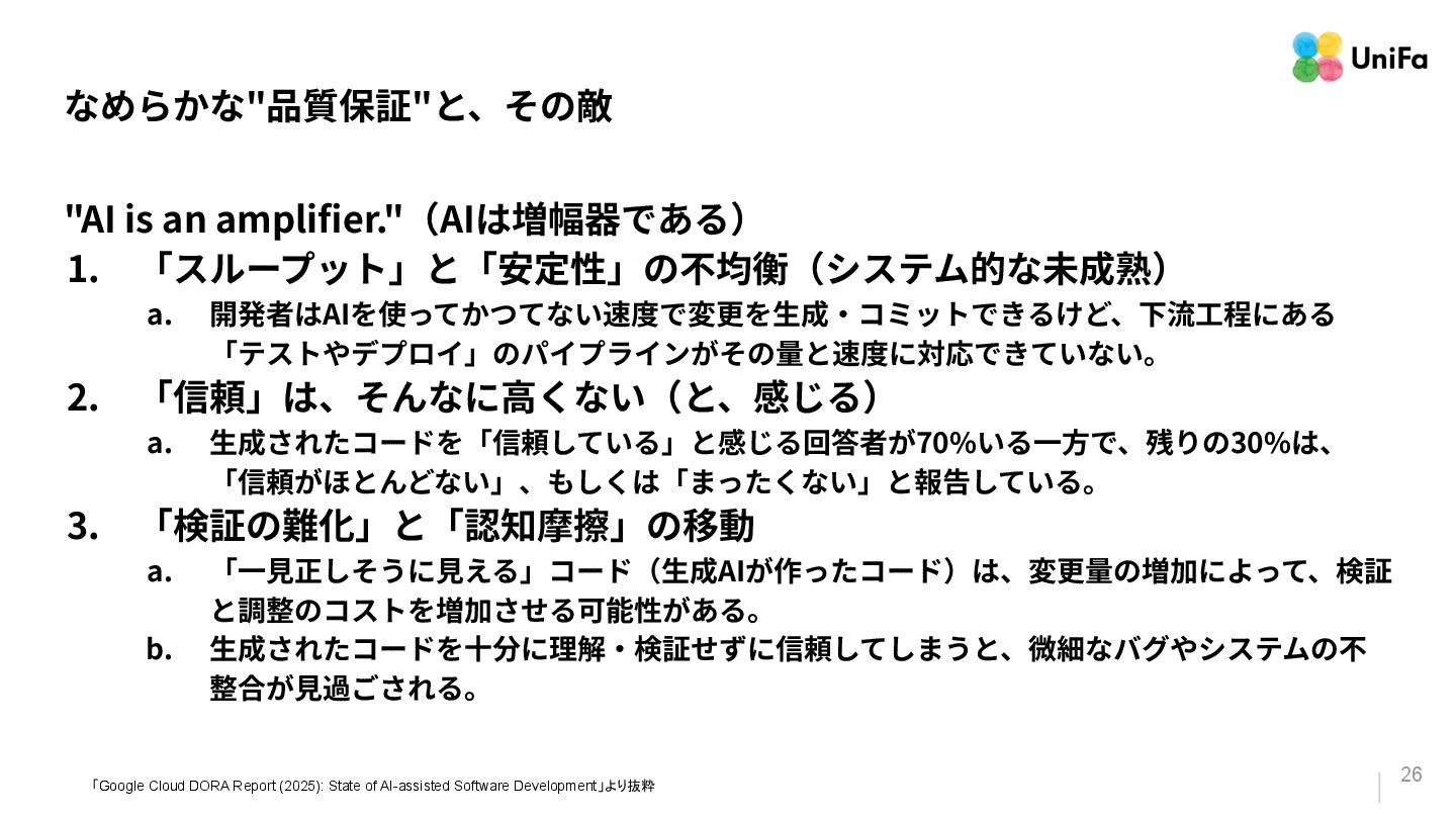 「テストやデプロイ」のパイプラインがその量と速度に対応できていない。 2. 「信頼」は、そんなに⾼くない(と、感じる) a. ⽣成されたコードを「信頼している」と感じる回答者が70%いる⼀⽅で、残りの30%は、 「信頼がほとんどない」、もしくは「まったくない」と報告している。 3. 「検証の難化」と「認知摩擦」の移動 a. 「⼀⾒正しそうに⾒える」コード(⽣成AIが作ったコード)は、変更量の増加によって、検証 と調整のコストを増加させる可能性がある。 b. ⽣成されたコードを⼗分に理解‧検証せずに信頼してしまうと、微細なバグやシステムの不 整合が⾒過ごされる。 「Google Cloud DORA Report (2025): State of AI-assisted Software Development」より抜粋