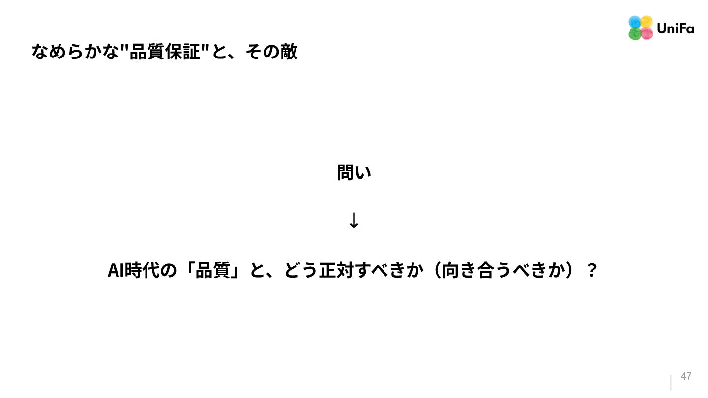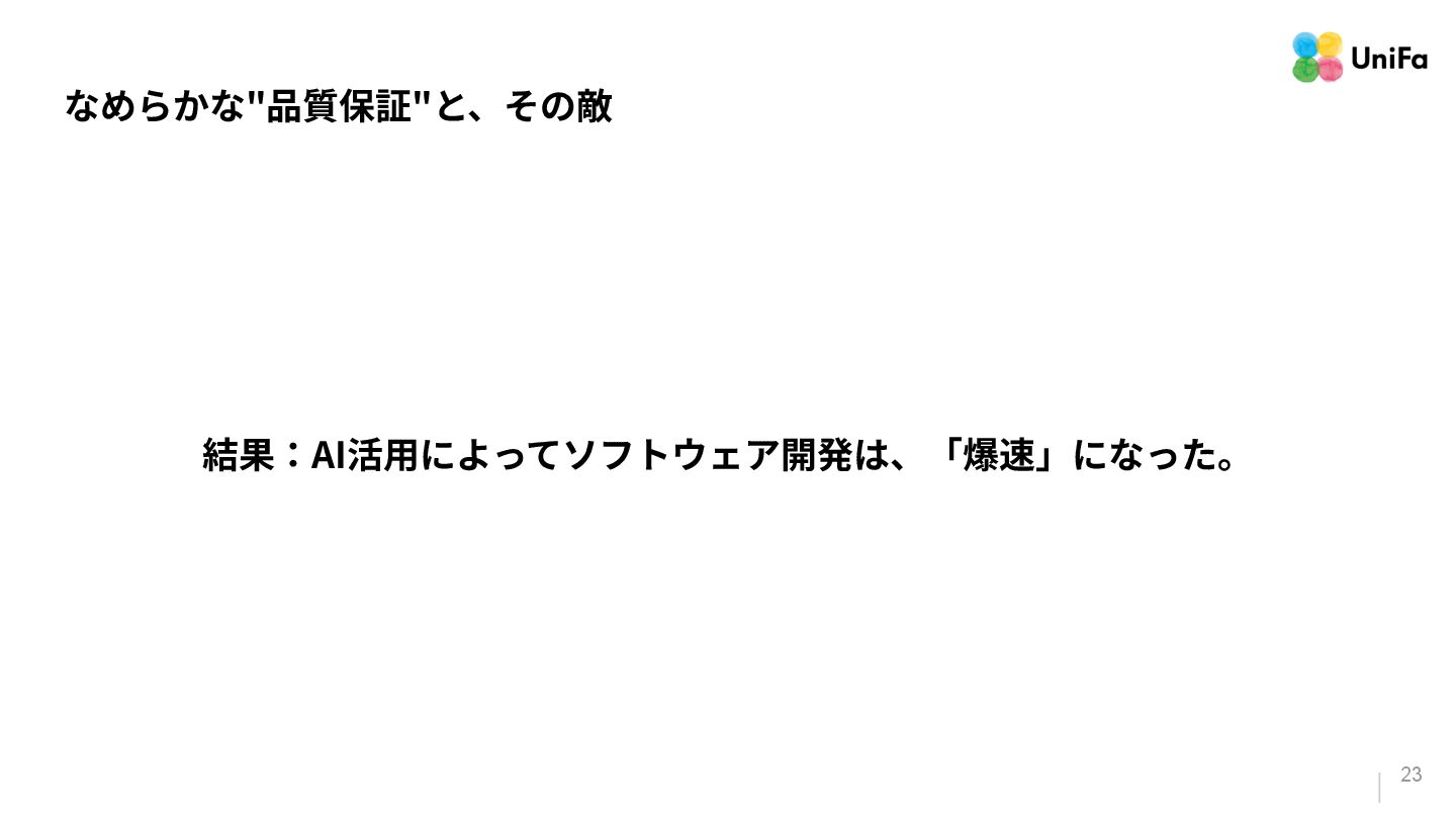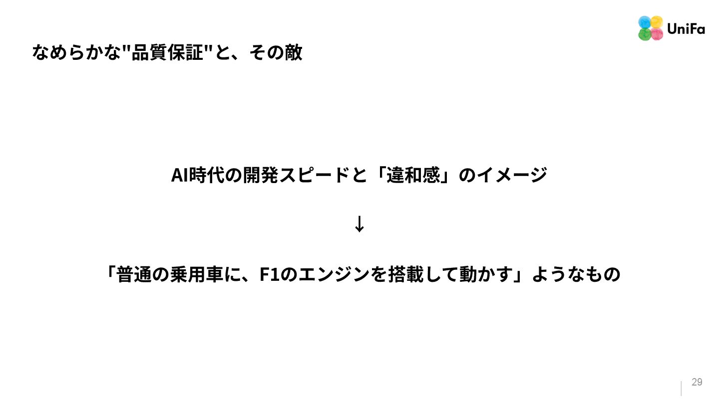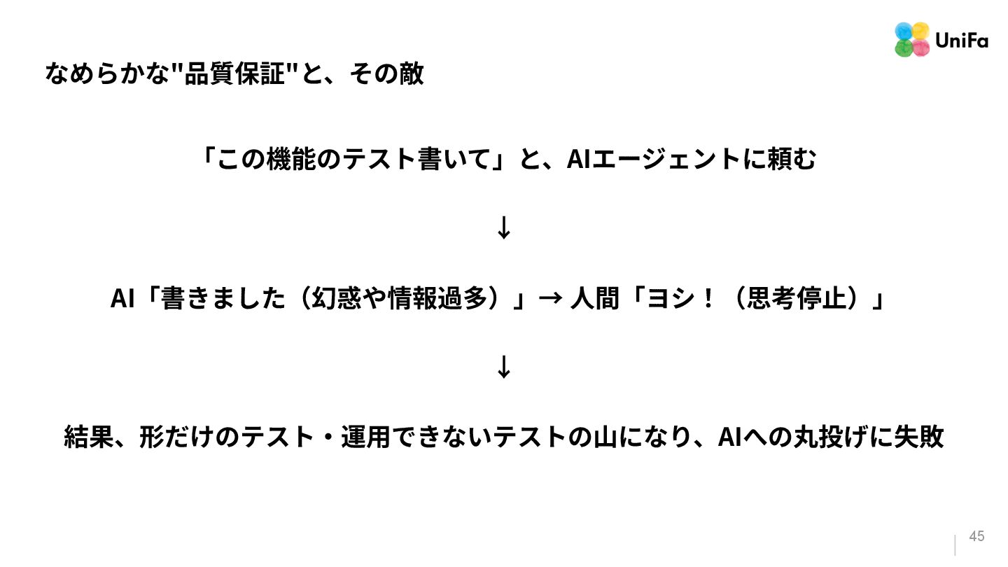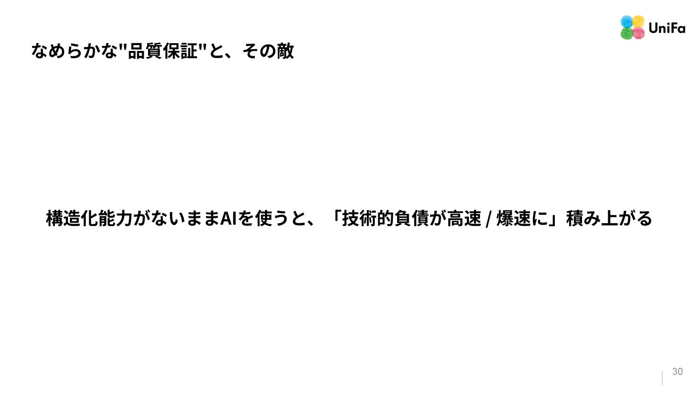 「テストやデプロイ」のパイプラインがその量と速度に対応できていない。 2. 「信頼」は、そんなに⾼くない(と、感じる) a. ⽣成されたコードを「信頼している」と感じる回答者が70%いる⼀⽅で、残りの30%は、 「信頼がほとんどない」、もしくは「まったくない」と報告している。 3. 「検証の難化」と「認知摩擦」の移動 a. 「⼀⾒正しそうに⾒える」コード(⽣成AIが作ったコード)は、変更量の増加によって、検証 と調整のコストを増加させる可能性がある。 b. ⽣成されたコードを⼗分に理解‧検証せずに信頼してしまうと、微細なバグやシステムの不 整合が⾒過ごされる。 「Google Cloud DORA Report (2025): State of AI-assisted Software Development」より抜粋
