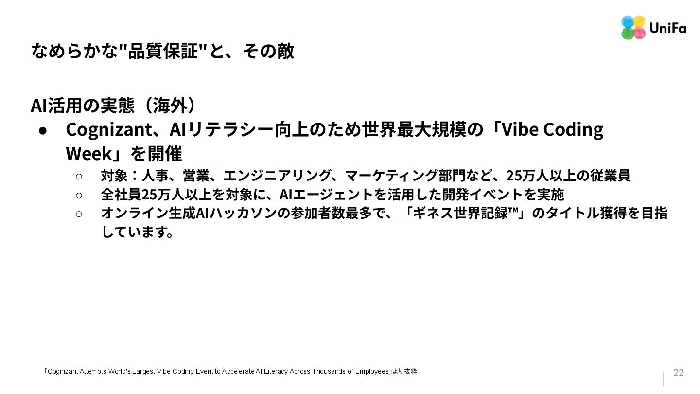 全社員25万⼈以上を対象に、AIエージェントを活⽤した開発イベントを実施 ◦ オンライン⽣成AIハッカソンの参加者数最多で、「ギネス世界記録™」のタイトル獲得を⽬指 しています。 「Cognizant Attempts World's Largest Vibe Coding Event to Accelerate AI Literacy Across Thousands of Employees」より抜粋