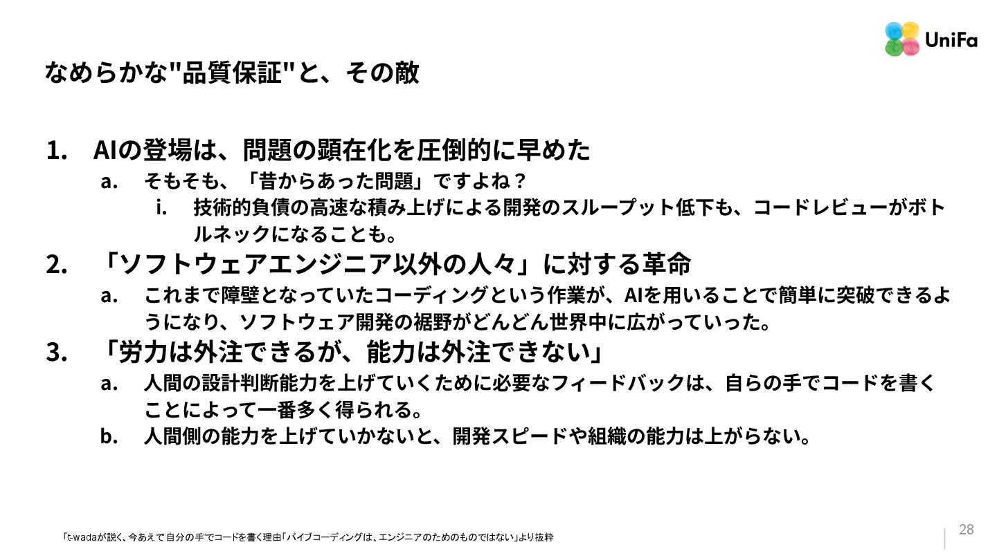 「ソフトウェアエンジニア以外の⼈々」に対する⾰命 a. これまで障壁となっていたコーディングという作業が、AIを⽤いることで簡単に突破できるよ うになり、ソフトウェア開発の裾野がどんどん世界中に広がっていった。 3. 「労⼒は外注できるが、能⼒は外注できない」 a. ⼈間の設計判断能⼒を上げていくために必要なフィードバックは、⾃らの⼿でコードを書く ことによって⼀番多く得られる。 b. ⼈間側の能⼒を上げていかないと、開発スピードや組織の能⼒は上がらない。 「t-wadaが説く、今あえて “自分の手”でコードを書く理由「バイブコーディングは、エンジニアのためのものではない」より抜粋