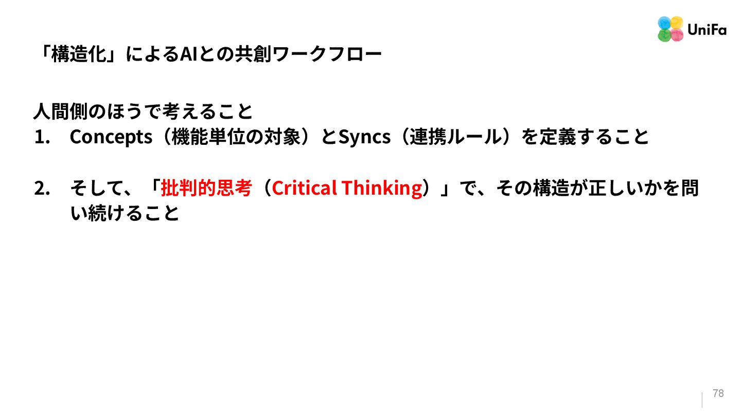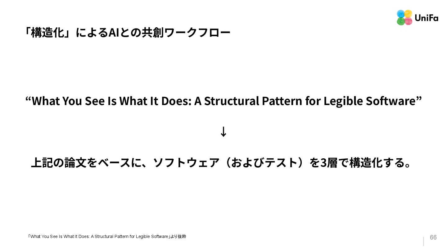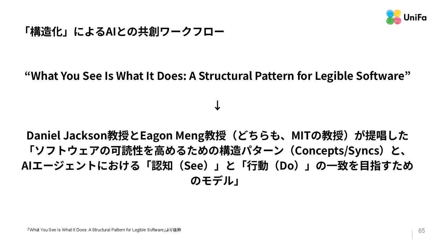 Structural Pattern for Legible Software” ↓ Daniel Jackson教授とEagon Meng教授(どちらも、MITの教授)が提唱した 「ソフトウェアの可読性を⾼めるための構造パターン(Concepts/Syncs)と、 AIエージェントにおける「認知(See)」と「⾏動(Do)」の⼀致を⽬指すため のモデル」 「What You See Is What It Does: A Structural Pattern for Legible Software」より抜粋