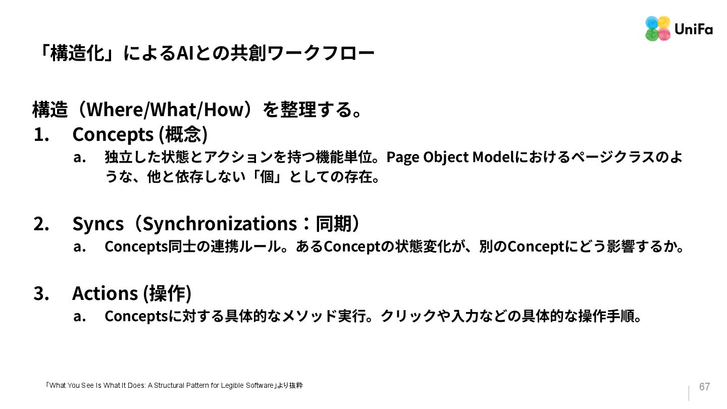 うな、他と依存しない「個」としての存在。 2. Syncs(Synchronizations:同期) a. Concepts同⼠の連携ルール。あるConceptの状態変化が、別のConceptにどう影響するか。 3. Actions (操作) a. Conceptsに対する具体的なメソッド実⾏。クリックや⼊⼒などの具体的な操作⼿順。 「What You See Is What It Does: A Structural Pattern for Legible Software」より抜粋