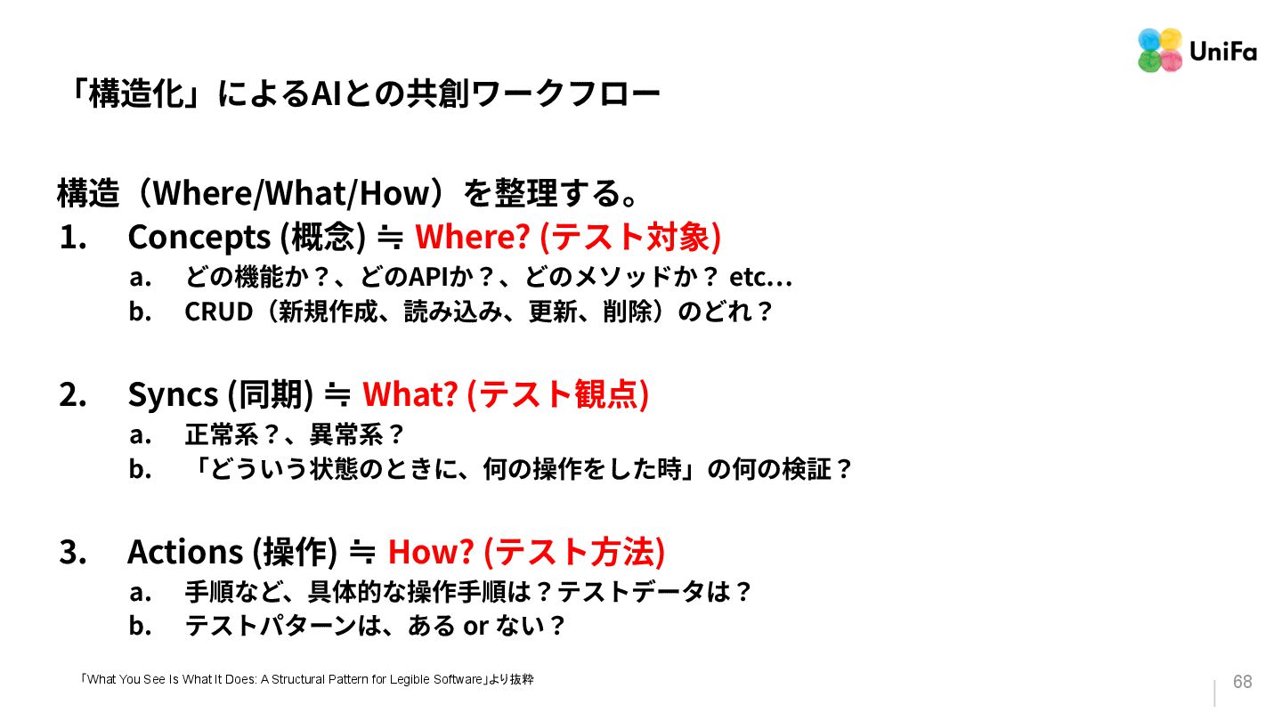 どの機能か?、どのAPIか?、どのメソッドか? etc… b. CRUD(新規作成、読み込み、更新、削除)のどれ? 2. Syncs (同期) ≒ What? (テスト観点) a. 正常系?、異常系? b. 「どういう状態のときに、何の操作をした時」の何の検証? 3. Actions (操作) ≒ How? (テスト⽅法) a. ⼿順など、具体的な操作⼿順は?テストデータは? b. テストパターンは、ある or ない? 「What You See Is What It Does: A Structural Pattern for Legible Software」より抜粋