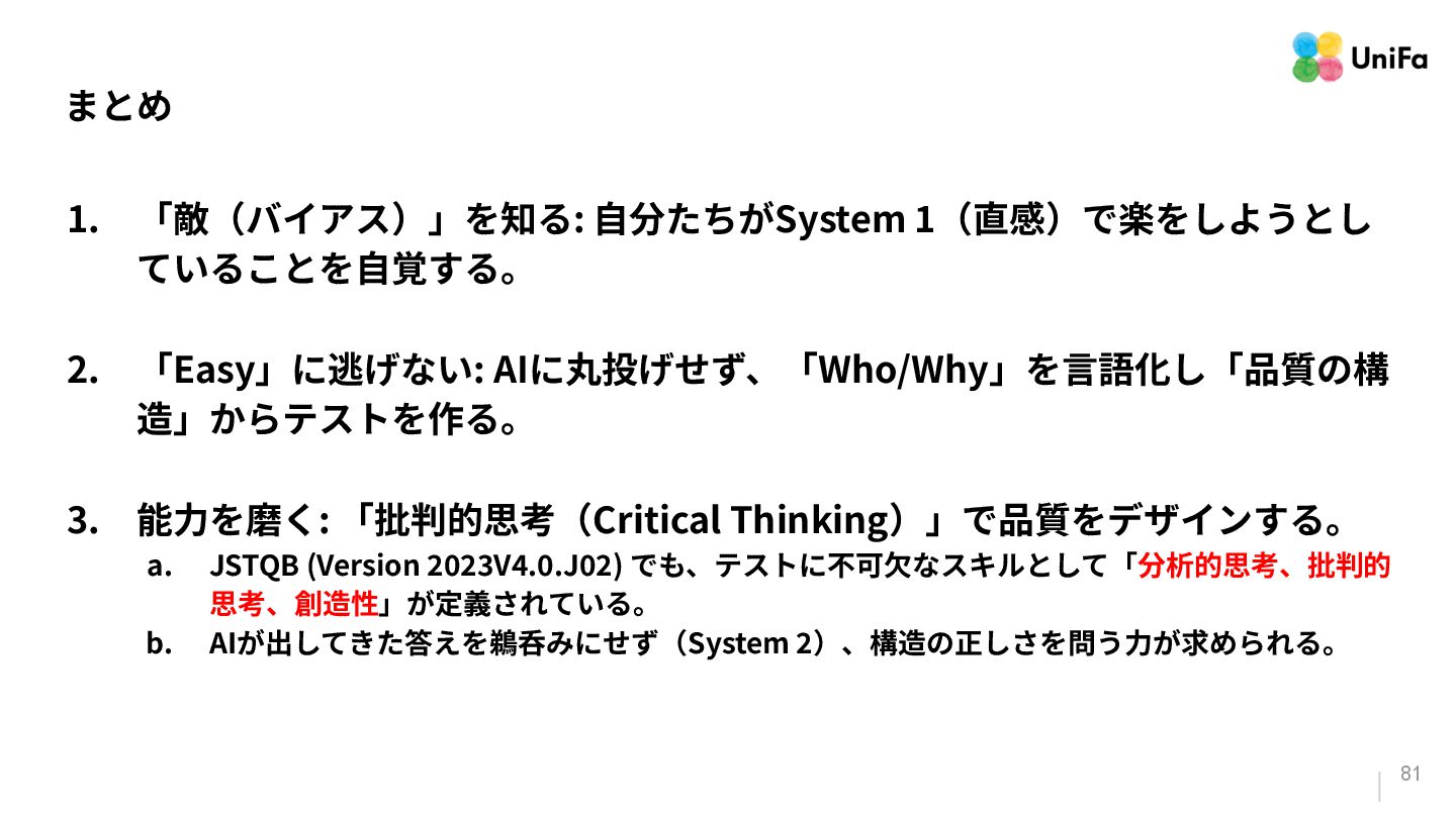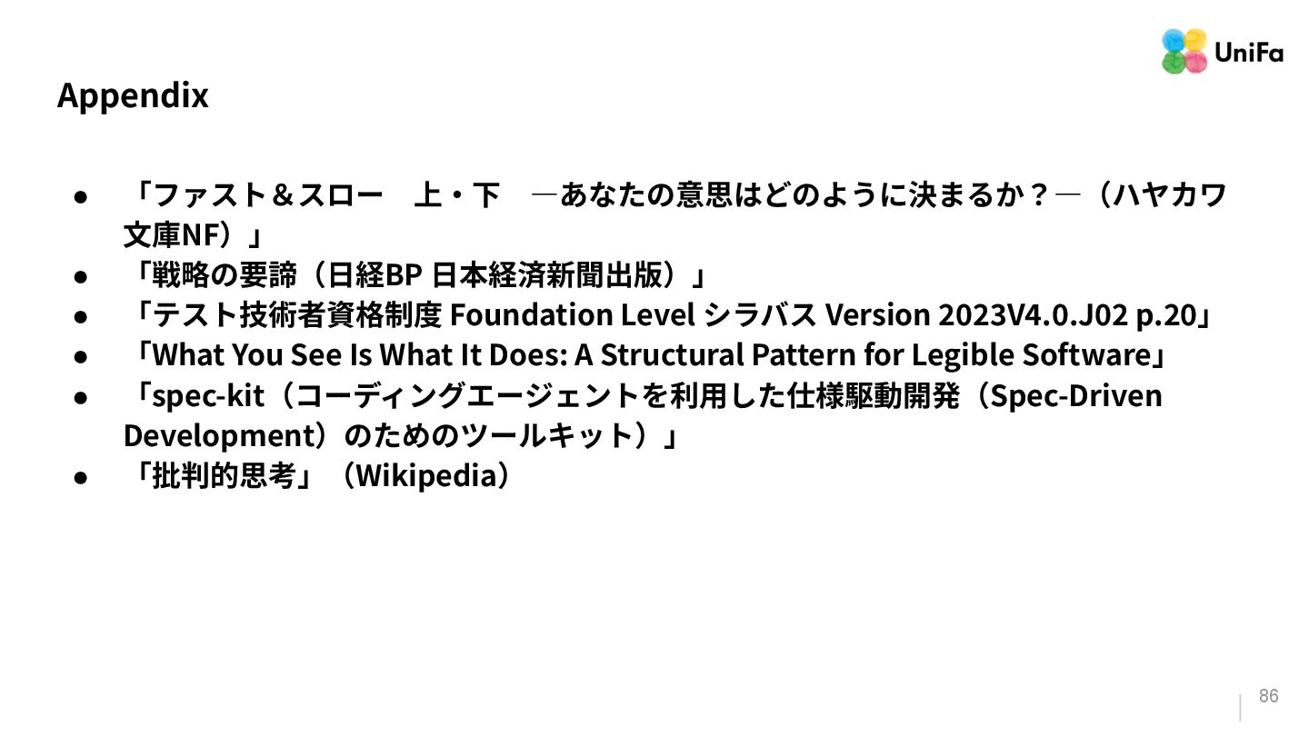 Foundation Level シラバス Version 2023V4.0.J02 p.20」 • 「What You See Is What It Does: A Structural Pattern for Legible Software」 • 「spec-kit(コーディングエージェントを利⽤した仕様駆動開発(Spec-Driven Development)のためのツールキット)」 • 「批判的思考」(Wikipedia)
