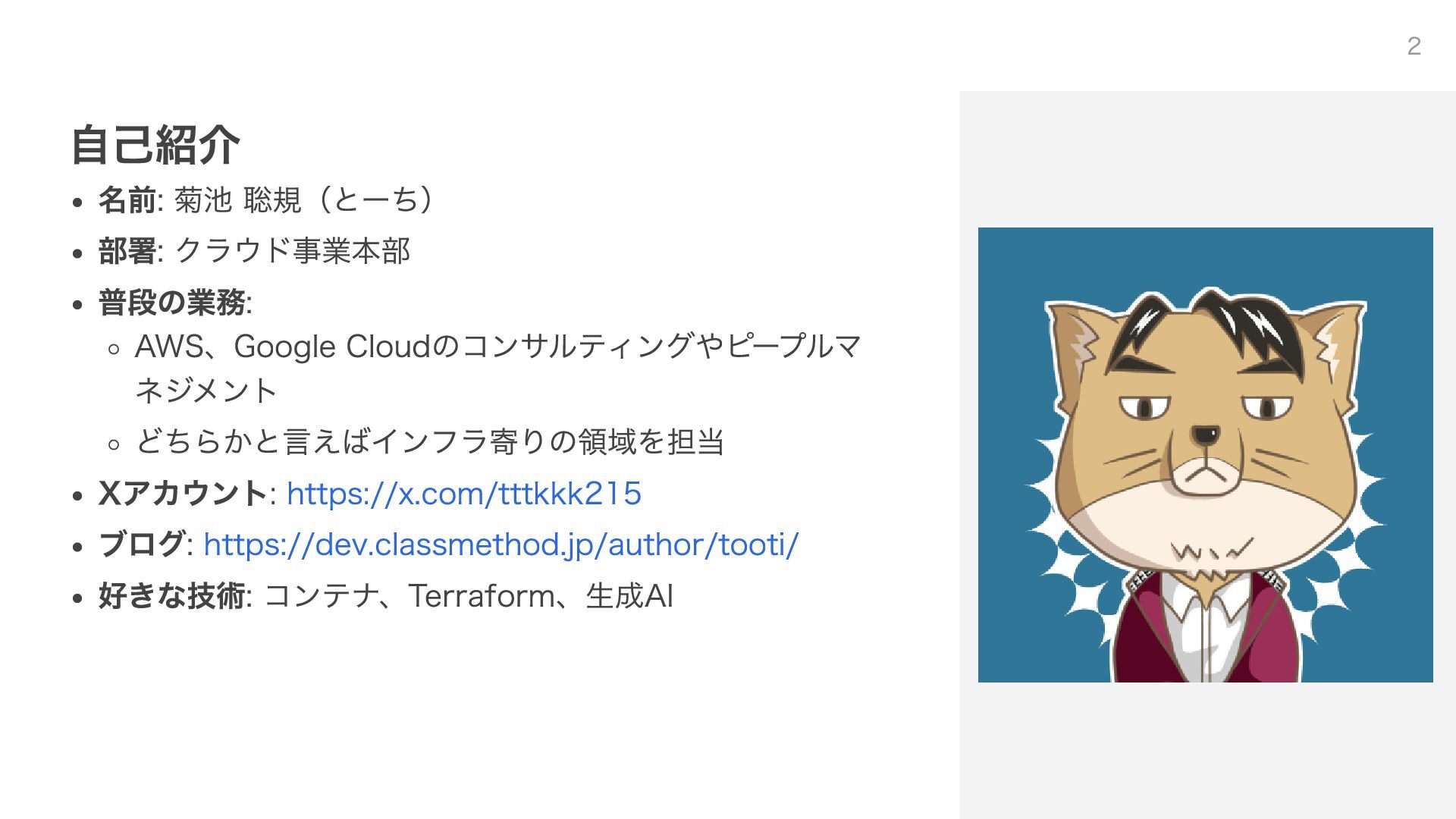 自己紹介 名前: 菊池 聡規(とーち) 部署: クラウド事業本部 普段の業務: AWS、Google Cloudのコンサルティングやピープルマ ネジメント