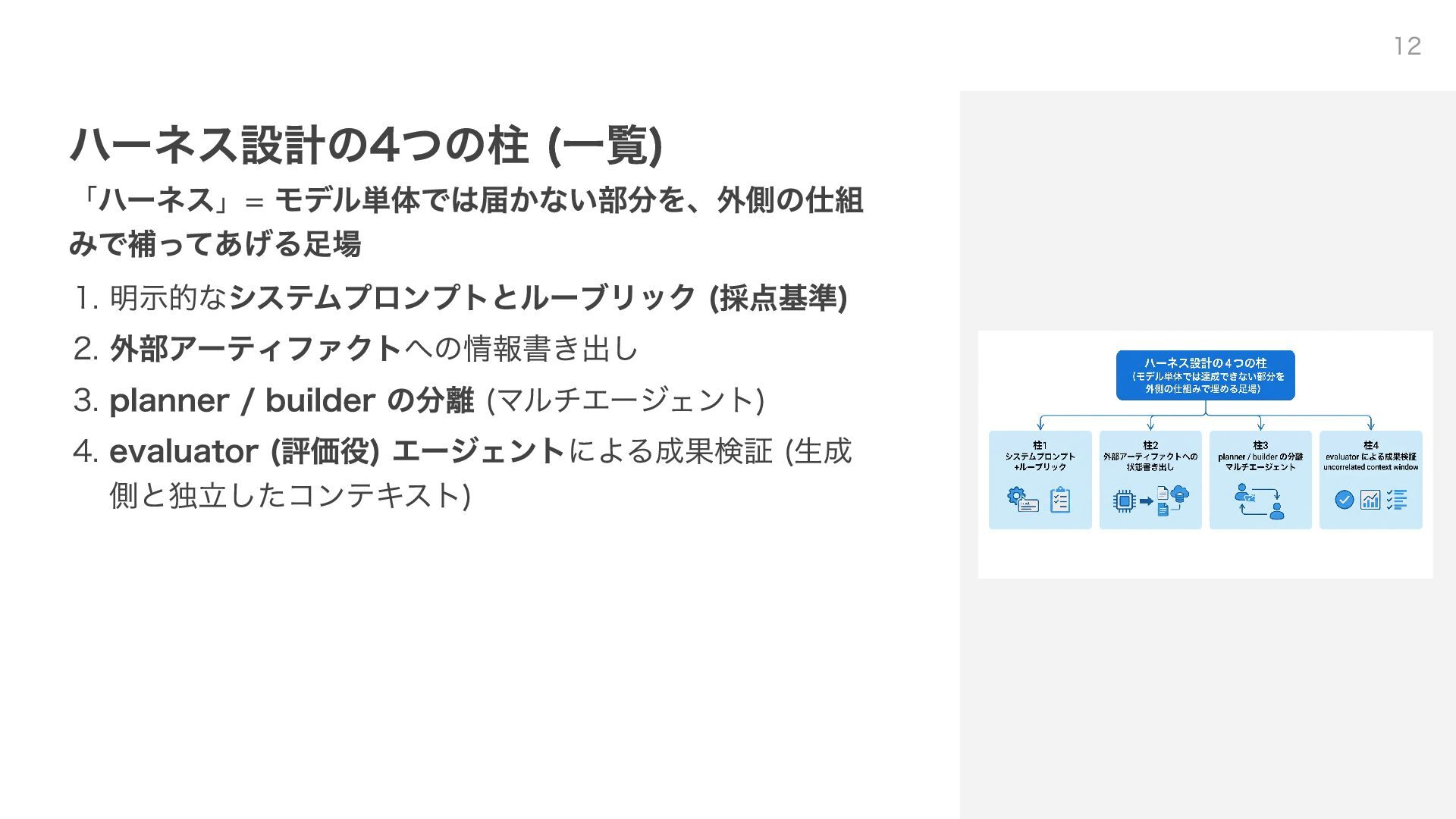 3. planner / builder の分離 (マルチエージェント) 4. evaluator (評価役) エージェントによる成果検証 (生成 側と独立したコンテキスト) 12