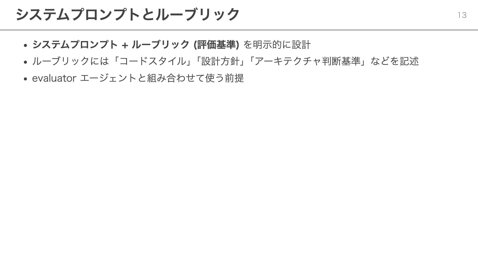 システムプロンプト + ルーブリック (評価基準) を明示的に設計 ルーブリックには「コードスタイル」 「設計方針」 「アーキテクチャ判断基準」などを記述 evaluator エージェントと組み合わせて使う前提