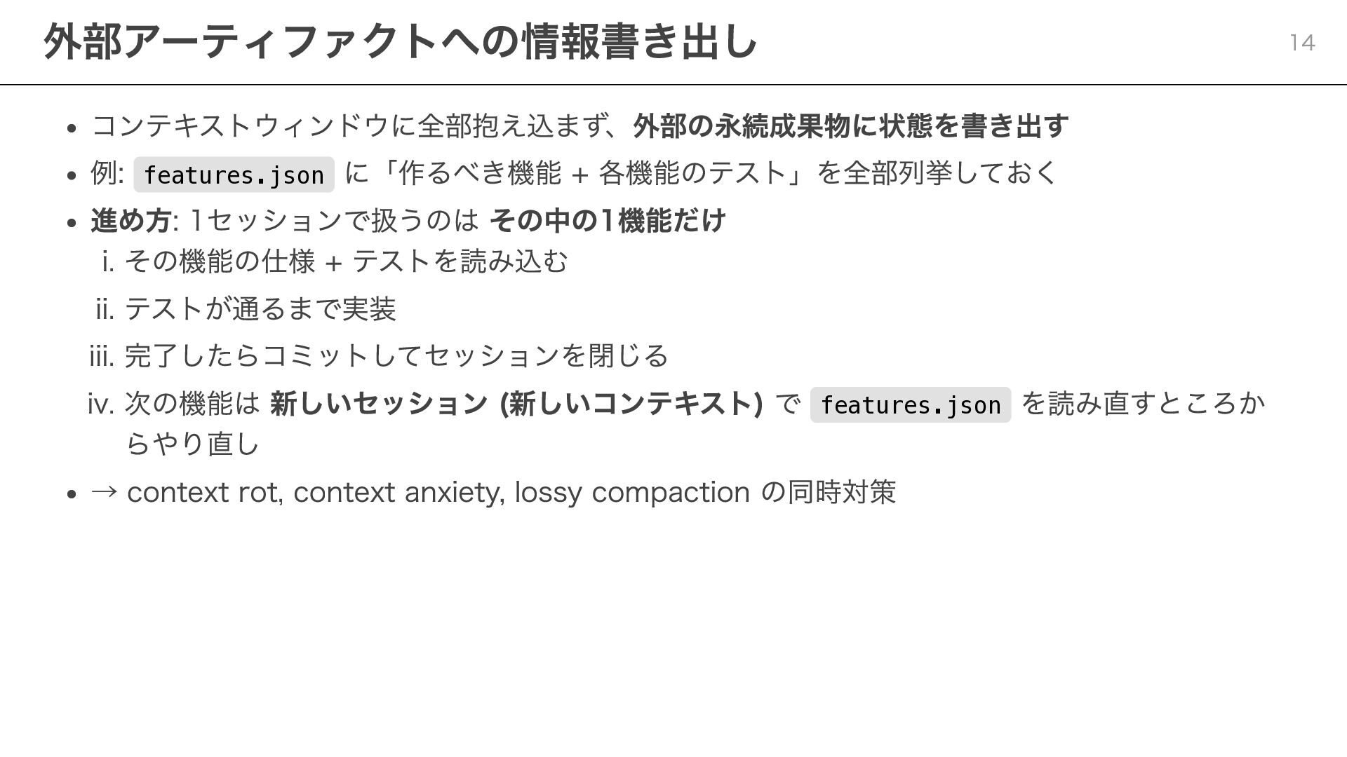その機能の仕様 + テストを読み込む ii. テストが通るまで実装 iii. 完了したらコミットしてセッションを閉じる iv. 次の機能は 新しいセッション (新しいコンテキスト) で features.json を読み直すところか らやり直し → context rot, context anxiety, lossy compaction の同時対策 外部アーティファクトへの情報書き出し 14