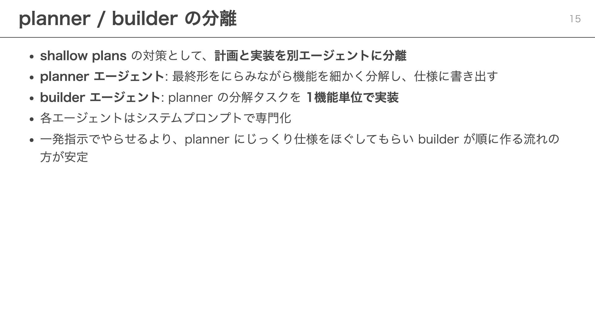 shallow plans の対策として、計画と実装を別エージェントに分離 planner エージェント: 最終形をにらみながら機能を細かく分解し、仕様に書き出す builder エージェント: planner の分解タスクを